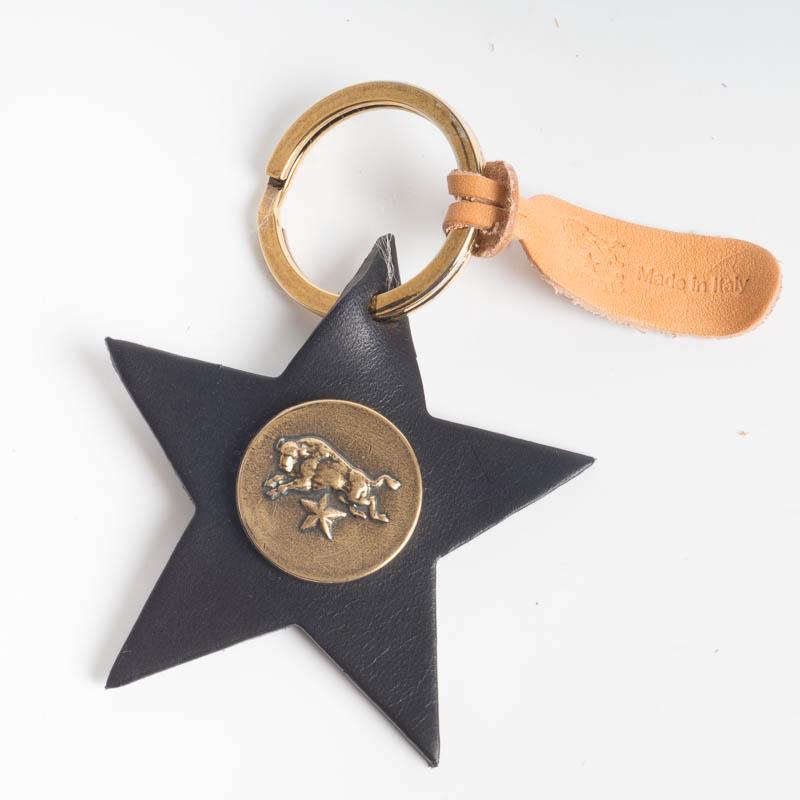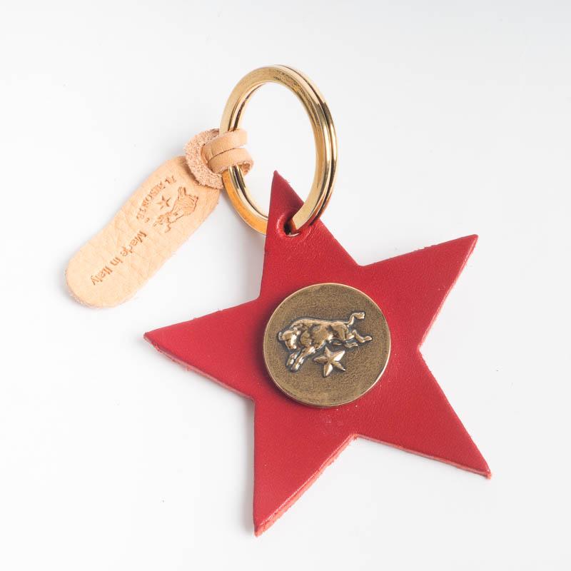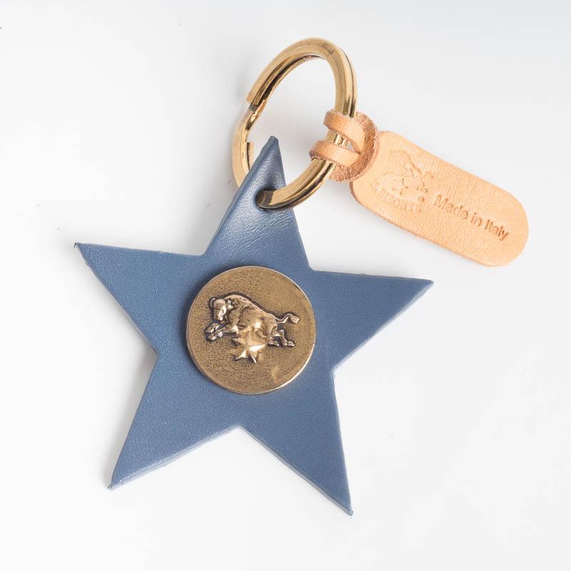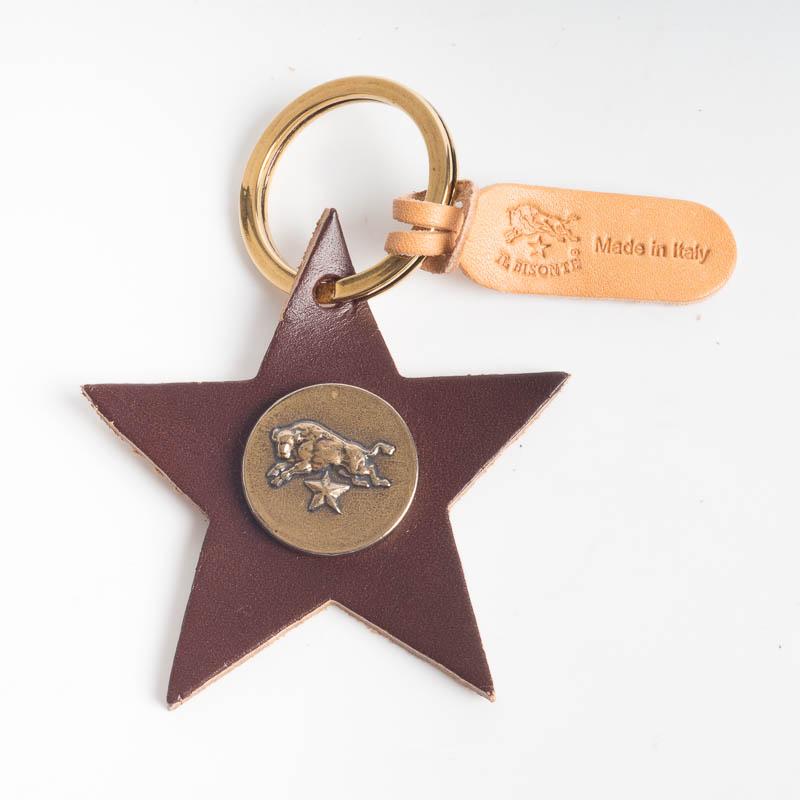 Portachiavi de Il Bisonte, realizzato in vacchetta invecchiata di vari colori con stemma del Brand su medaglia. Anello e dettagli in ottone.