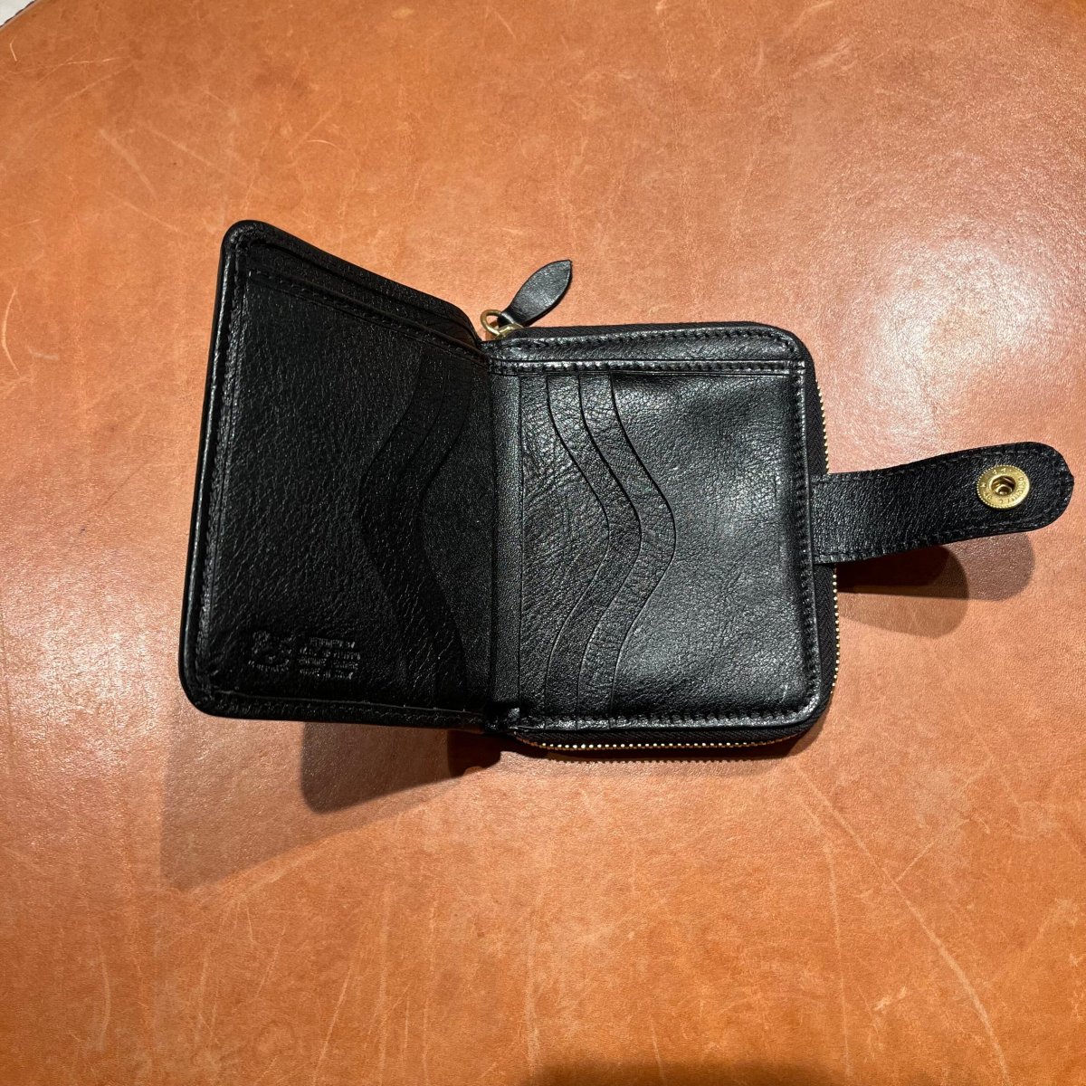 Portafoglio da donna de Il Bisonte in pelle di vacchetta volonata di color nero. Chiusura con bottone automatico, slot per banconote e 6 slot per carte di credito. Apertura con zip su tre lati con tasca portamonete e 2 slot portacarte.