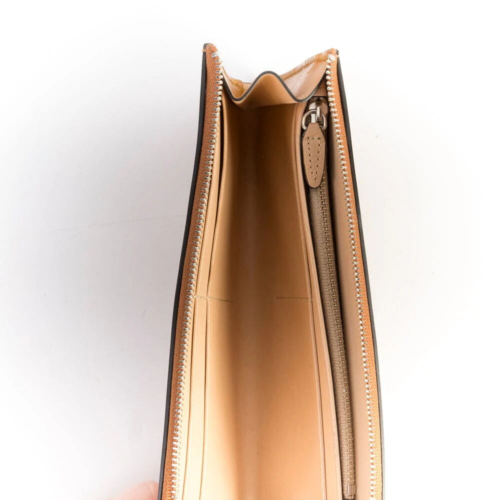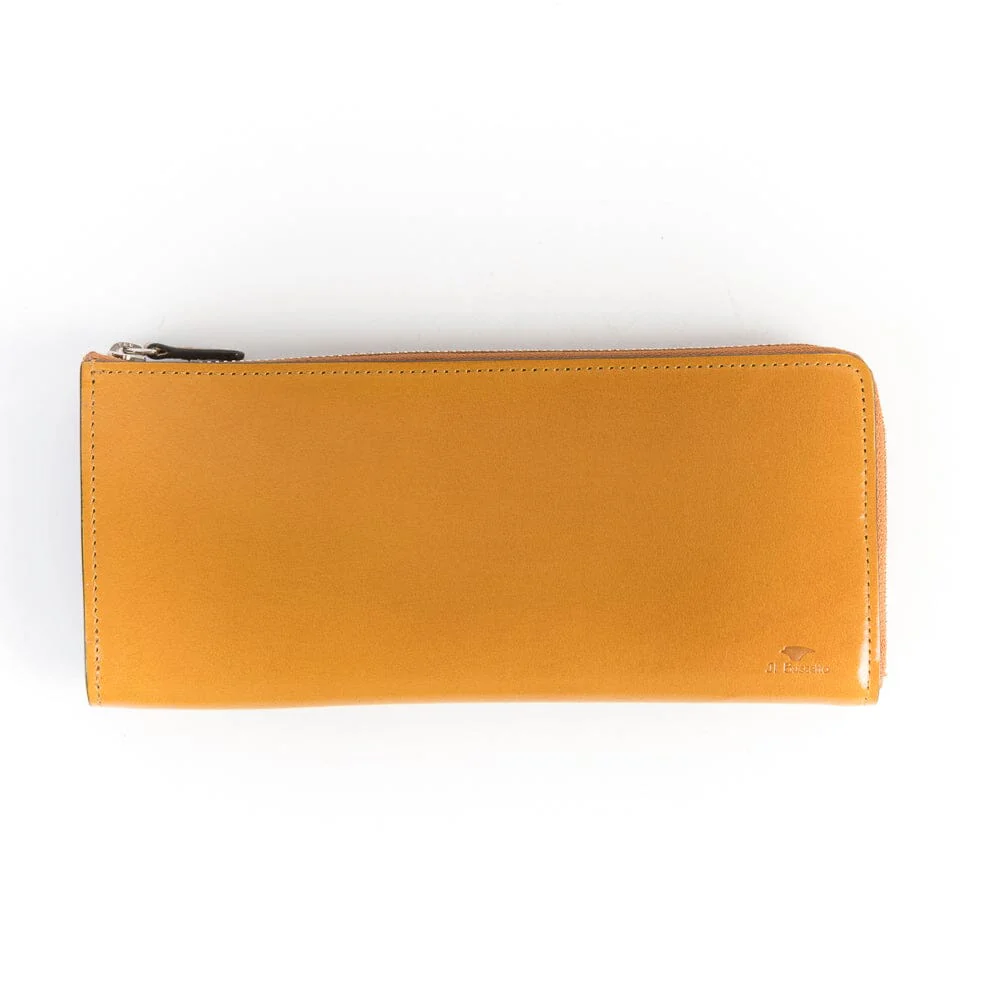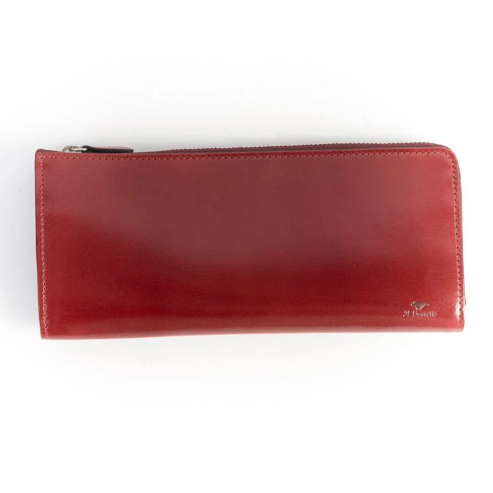 Portafogli de IL BUSSETTO, realizzato artigianalmente in pelle pregiata conciata al vegetale, nei colori ottanio, bordeaux e cuoio ad effetto lucido. Dotato di doppia slot porta carte da 2 scomparti, e taschina interna con chiusura a zip. Chiusura principale con zip.