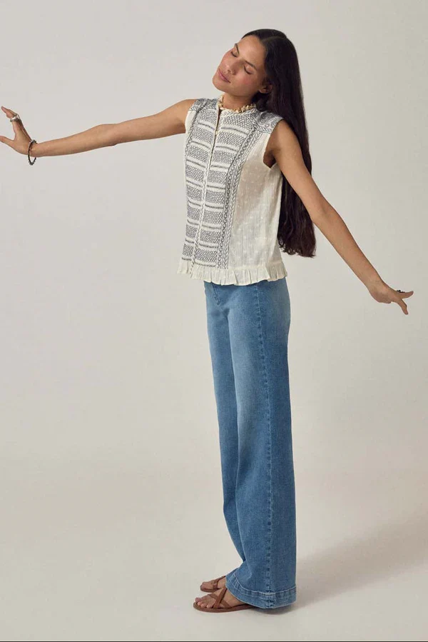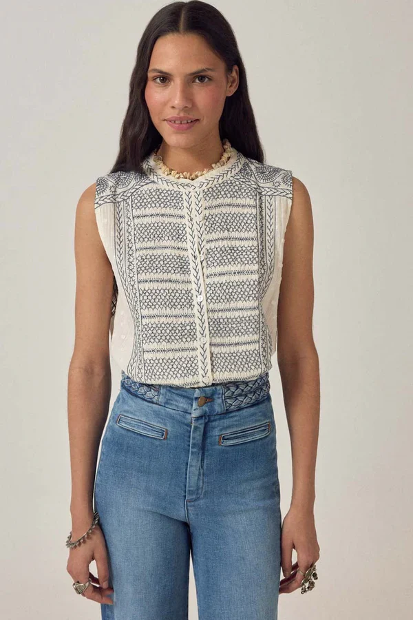 Camicetta senza maniche in morbida garza di cotone color crema con ricamo blu navy che copre il pannello frontale. Scollo rotondo con finiture ricamate, bottoni sul davanti, montato attraverso il corpo, rifinito con una balza sull’orlo. Senza maniche con dettagli ricamati che incorniciano il pannello centrale.