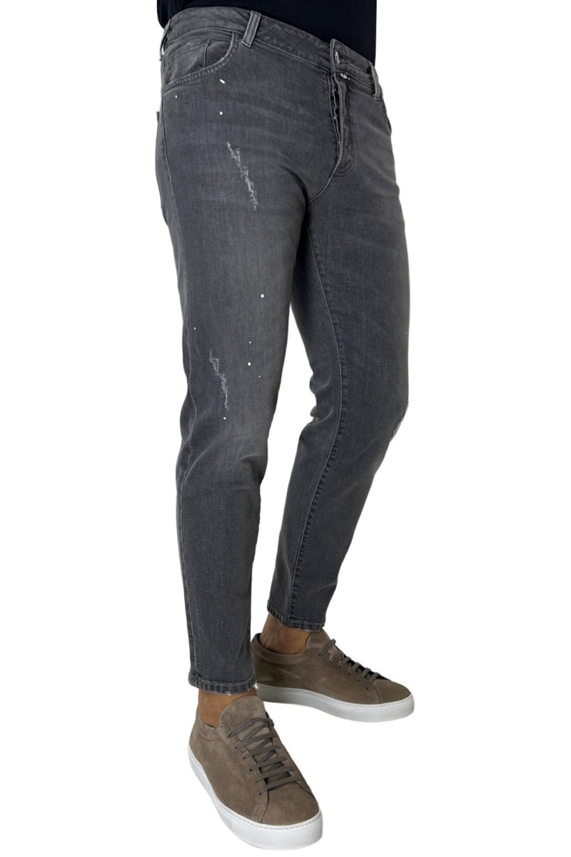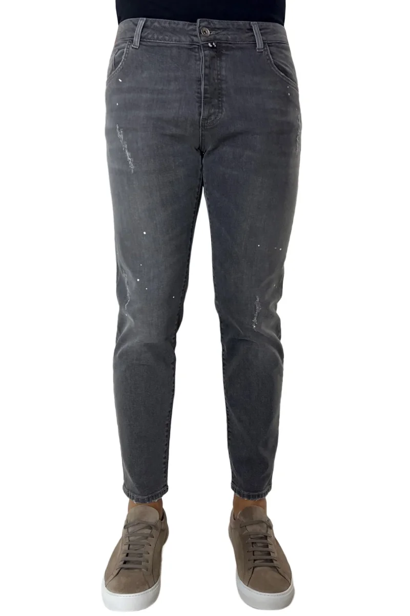 Il Jeans strappati da uomo grigio medio con leggere sabbiature bianche e schizzi di pittura e ormai per i nostri clienti sinonimo di garanzia e qualita.Questo modello, viene scelto da una tipologia di persone che amano vestire benee nello stesso tempo scelgono la comodita. Infatti grazie alle caratteristiche del tessuto morbido e leggermente elastico a chi lo indossa di scegliere la sua misuraperfetta e non preoccuparsi delle limitazioni dei movimenti nonostante la sua vestibilita slim.