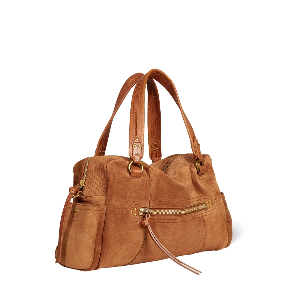 Bauletto Lucky di Jérôme Dreyfuss realizzato in camoscio di colore cuoio scuro. Minuteria in ottone brunito. Chiusura principale con zip e tiretto in pelle. Interno foderato in tessuto con tasca chiusa con zip. Ulteriori taschine esterne, laterali chiuse da magnete e altra tasca esterna chiusa da zip. Dotata di doppia tracolla una realizzata in pelle con piccoli moschettoni colore ottone brunito, più una tracolla regolabile in tessuto e pelle di colore beige e cuoio.