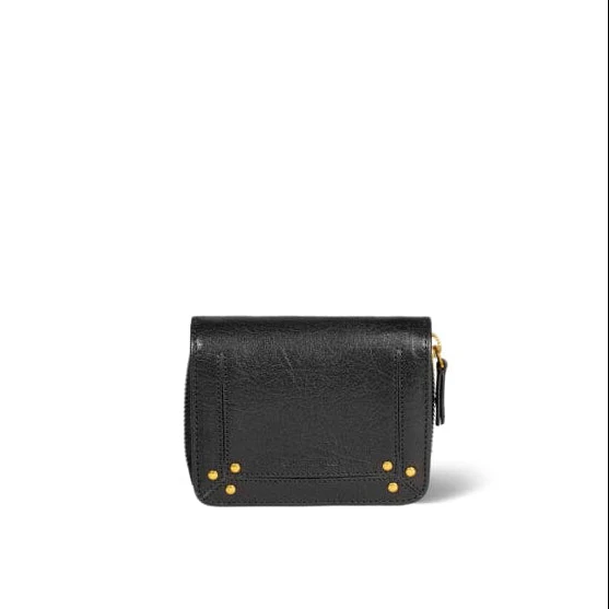 Portafoglio Andre di Jerome Dreyfuss realizzato in pelle di capra di colore nero. Chiusura con zip su tre lati per tasca portamonete. Chiusura con clip, interno in pelle di colore nero diviso in 6 scomparti per carte e contanti. Applicazione di rivetti metallici emblema della Maison.