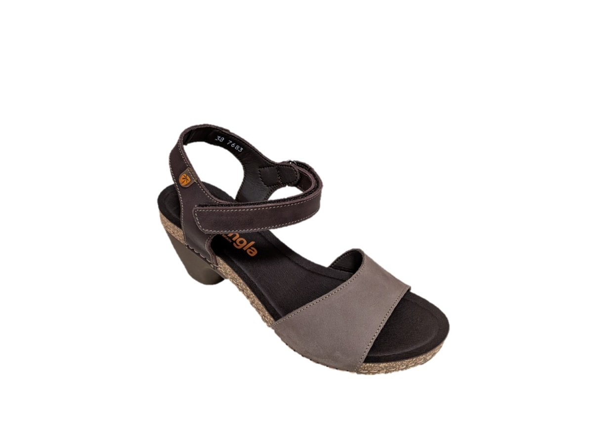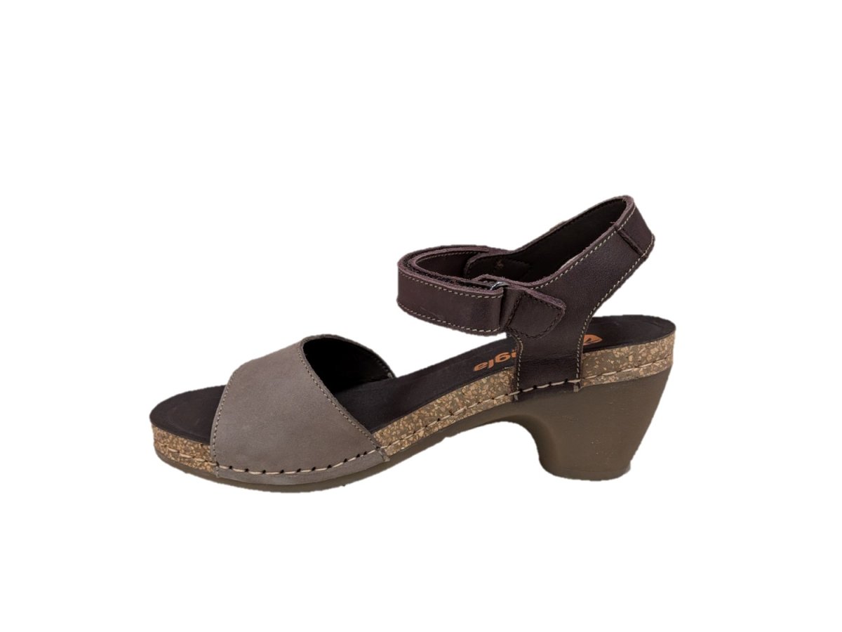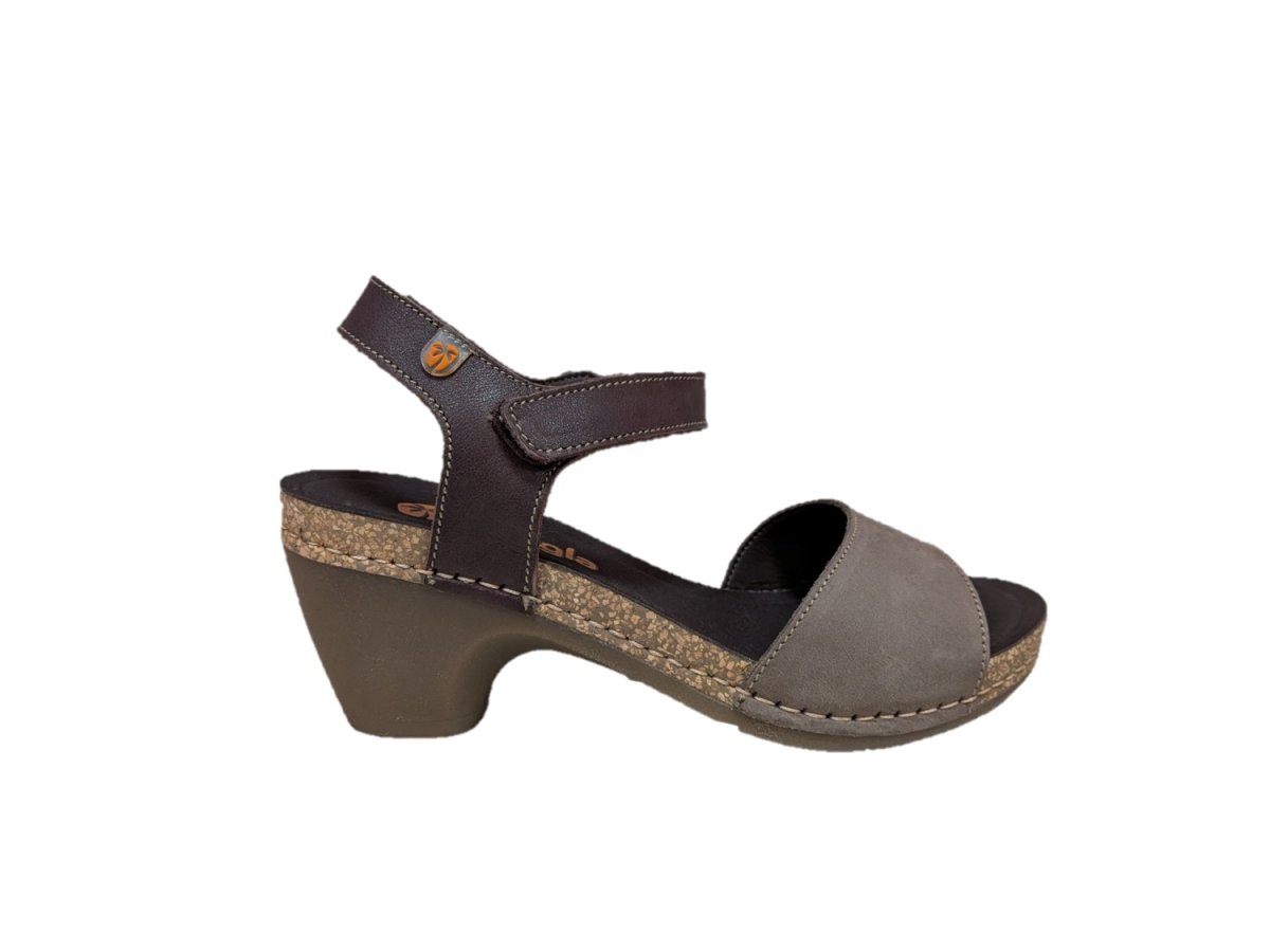 sandali in pelle nabuk, tacco 5,5cm, suola in gomma, allacciatura con velcro.