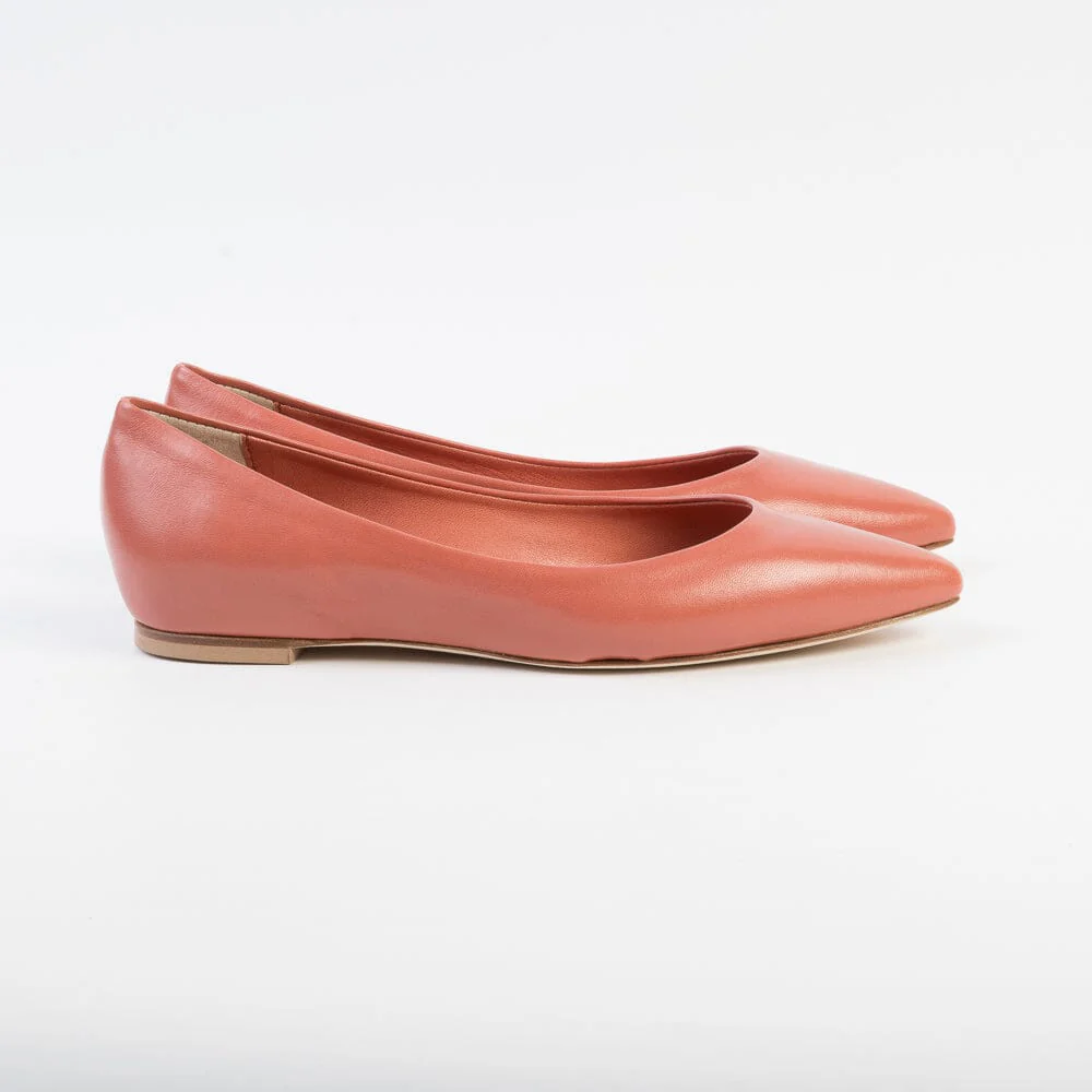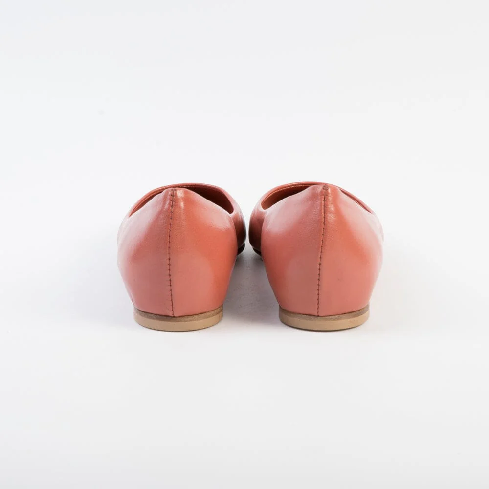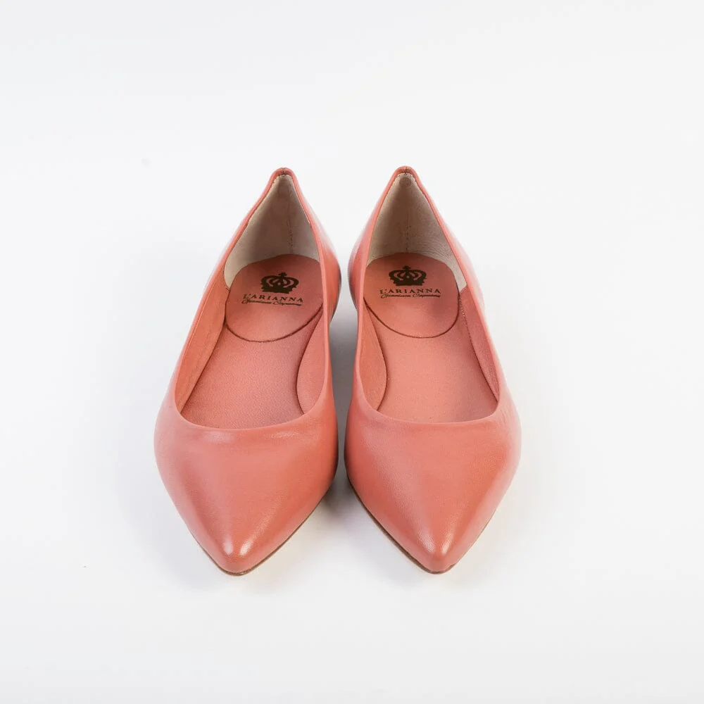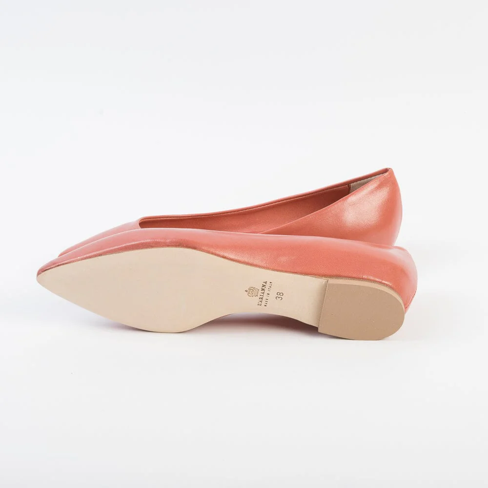 Ballerine a punta di L’Arianna realizzate con costruzione a sacchetto in morbida pelle di colore rosa salmone. Soletto interno imbottito in gomma piuma per un totale comfort della calzata, realizzato in tono con la tomaia. Suola esterna in cuoio.