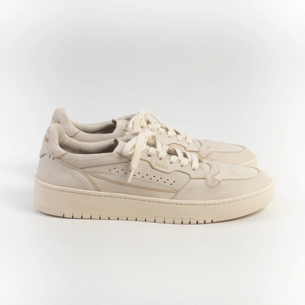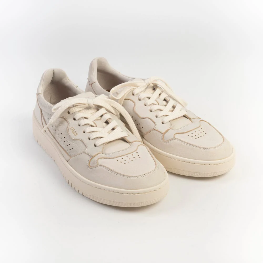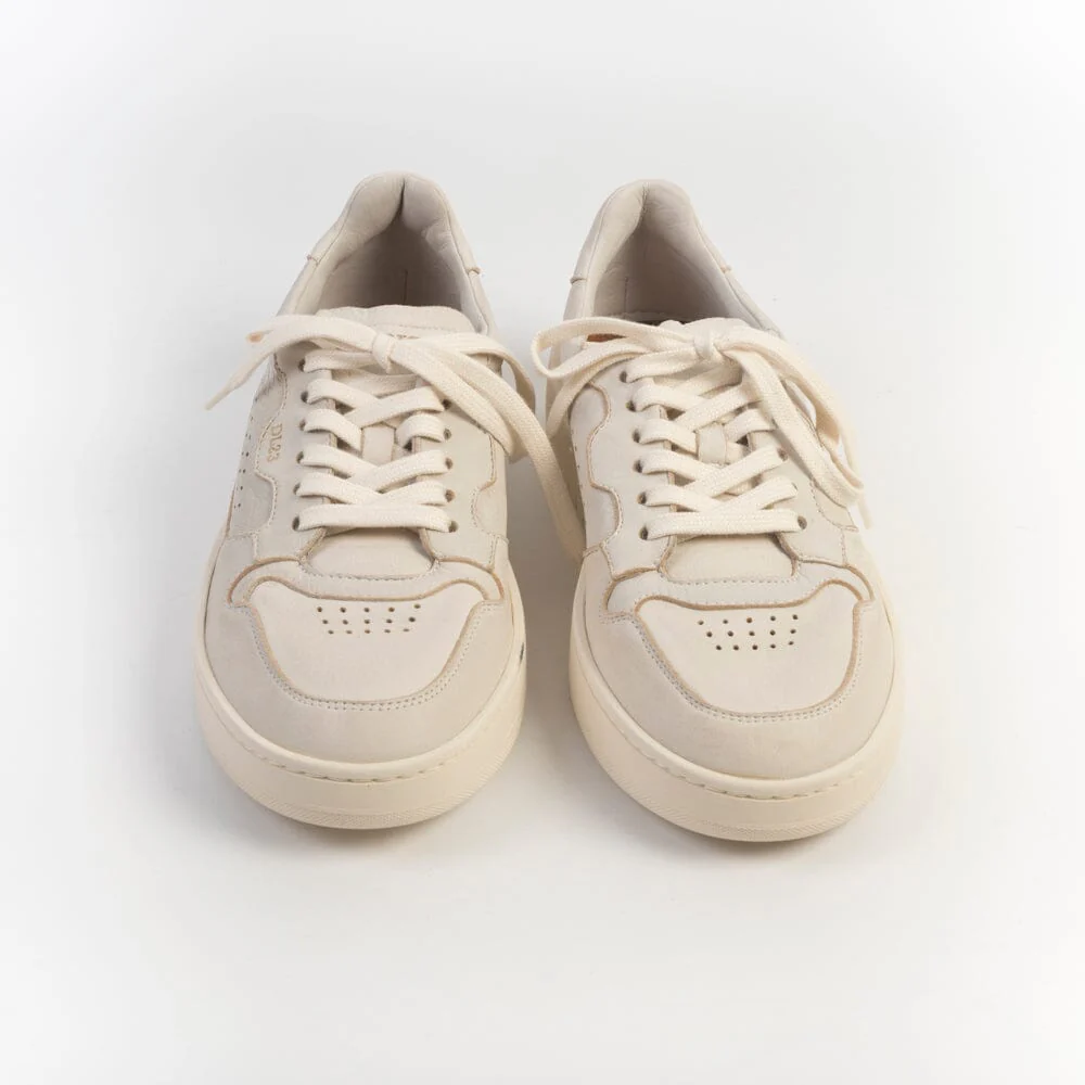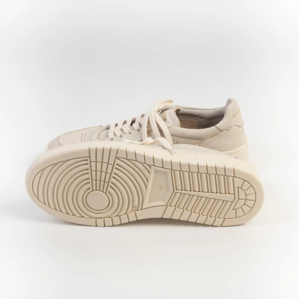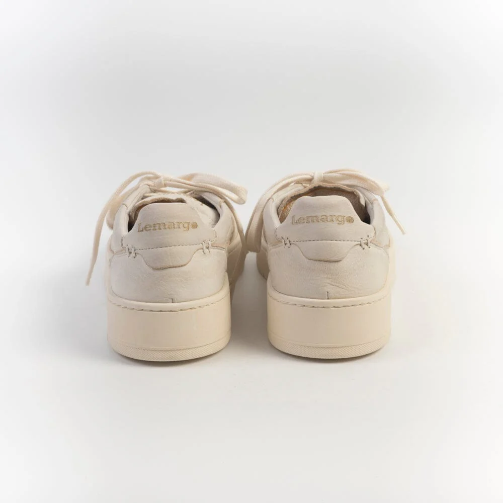 Sneakers LEMARGO, realizzate in morbida pelle di cervo di colore avorio con effetti anticati. Dettaglio tallone con logo impresso in nuance. Interno foderato in morbida spugna di cotone. Morbidi lacci di cotone in nuance. Plantare in pelle estraibile di 1.5 centimetri. Fondo a cassetta in gomma in nuance.