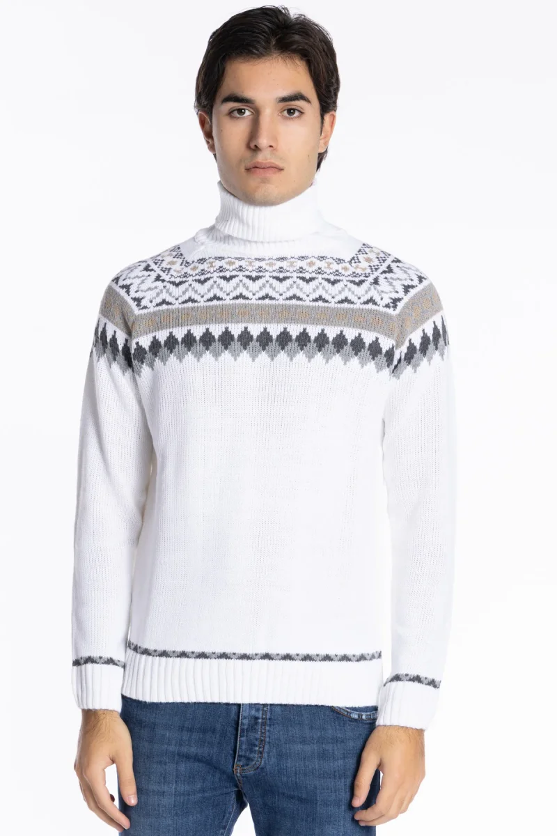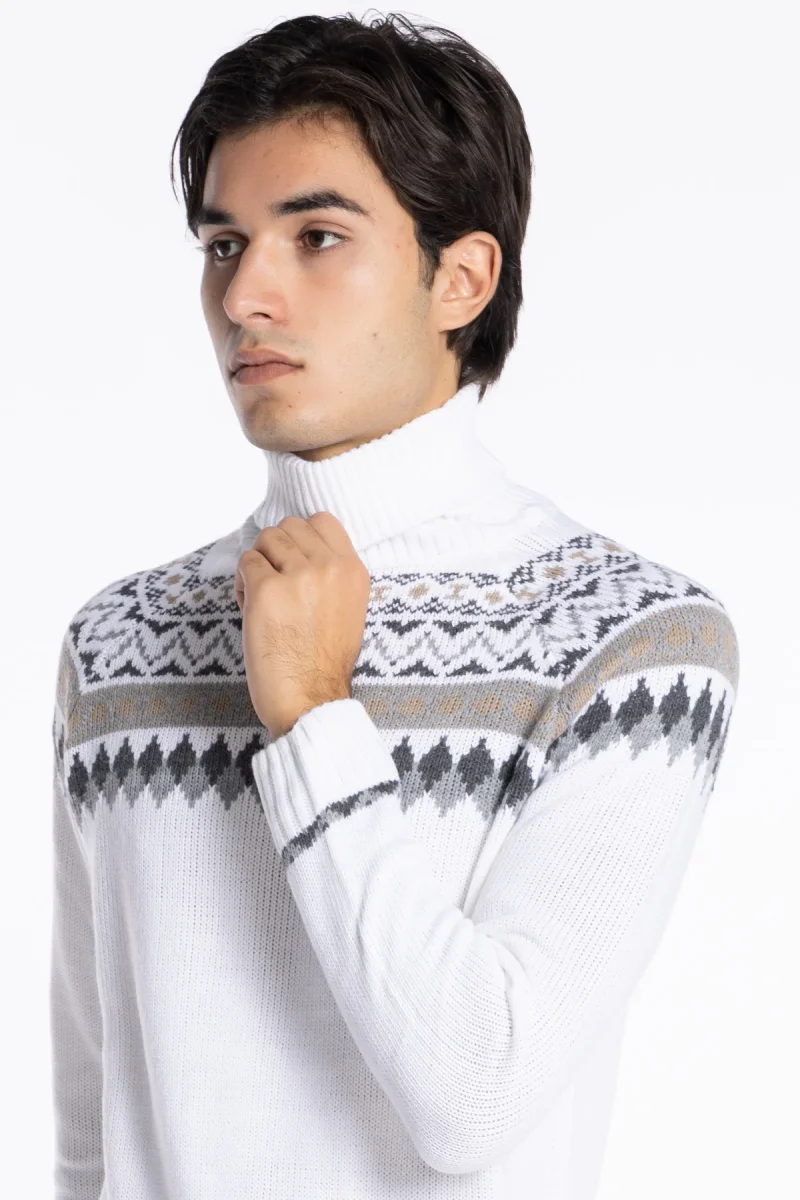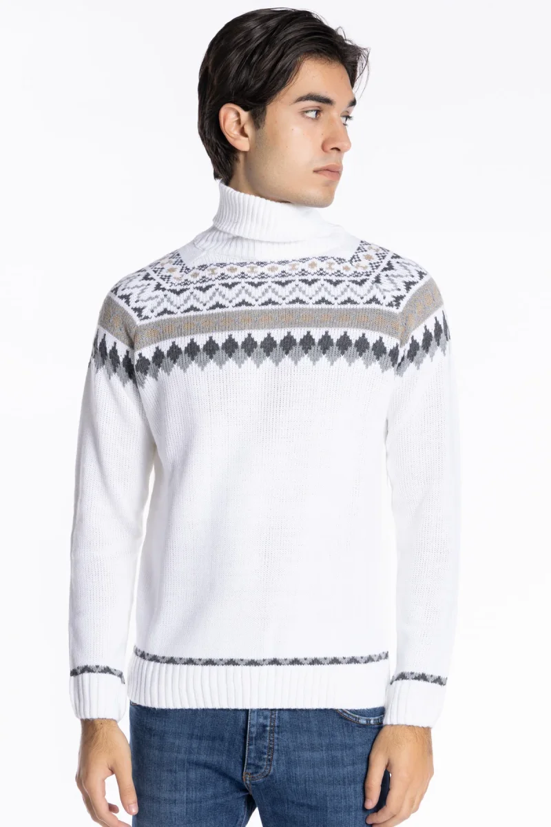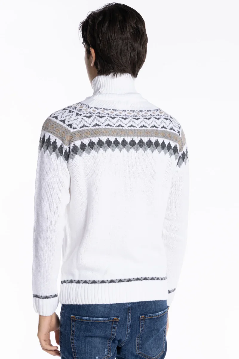 MAGLIONE DA UOMO COLLO ALTO BIANCO FANTASIA JACQUARD BIANCA E GRIGIA MANICHE LUNGHE