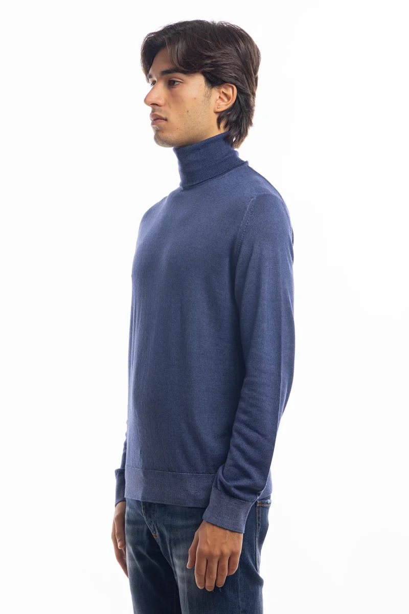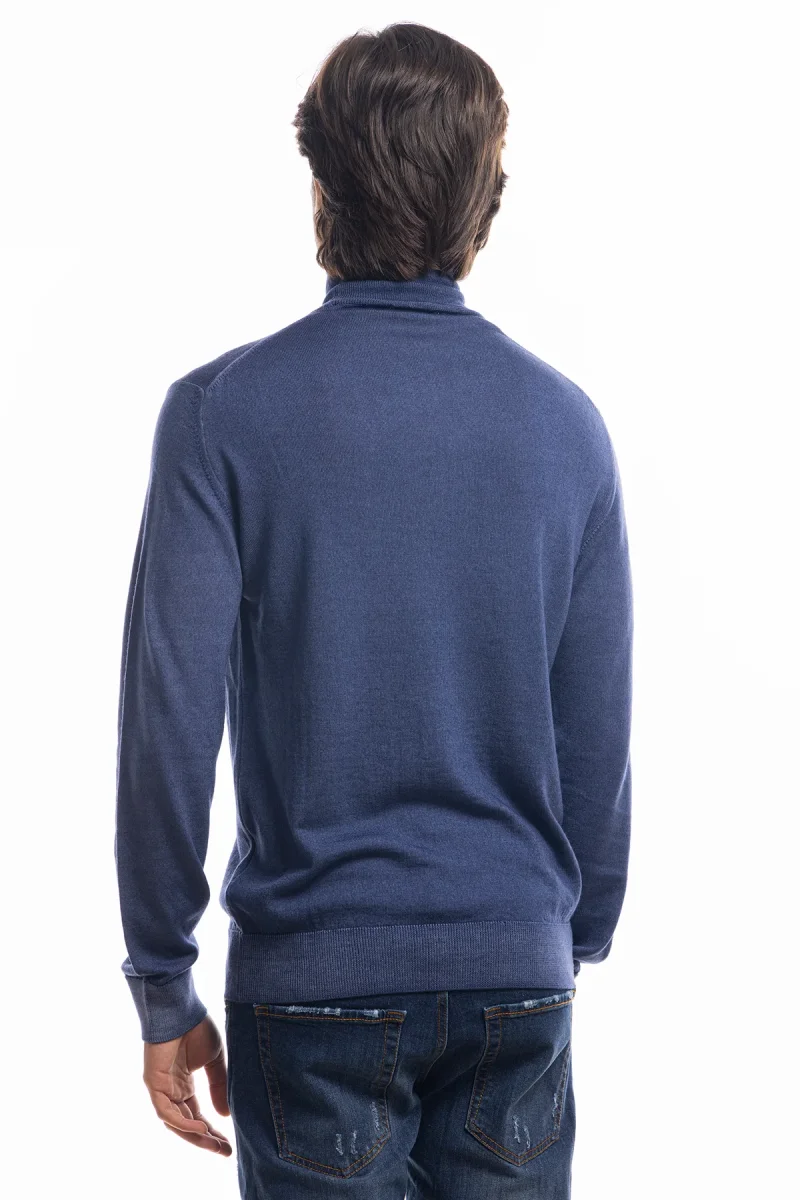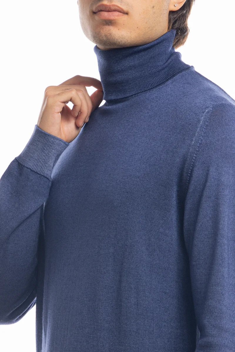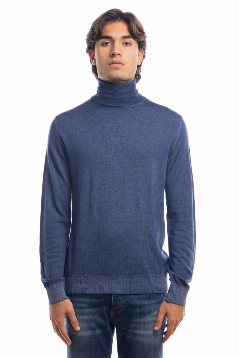 Maglione da uomo collo alto color denim blu in lana merinos 100%maniche lunghe effetto stone wash