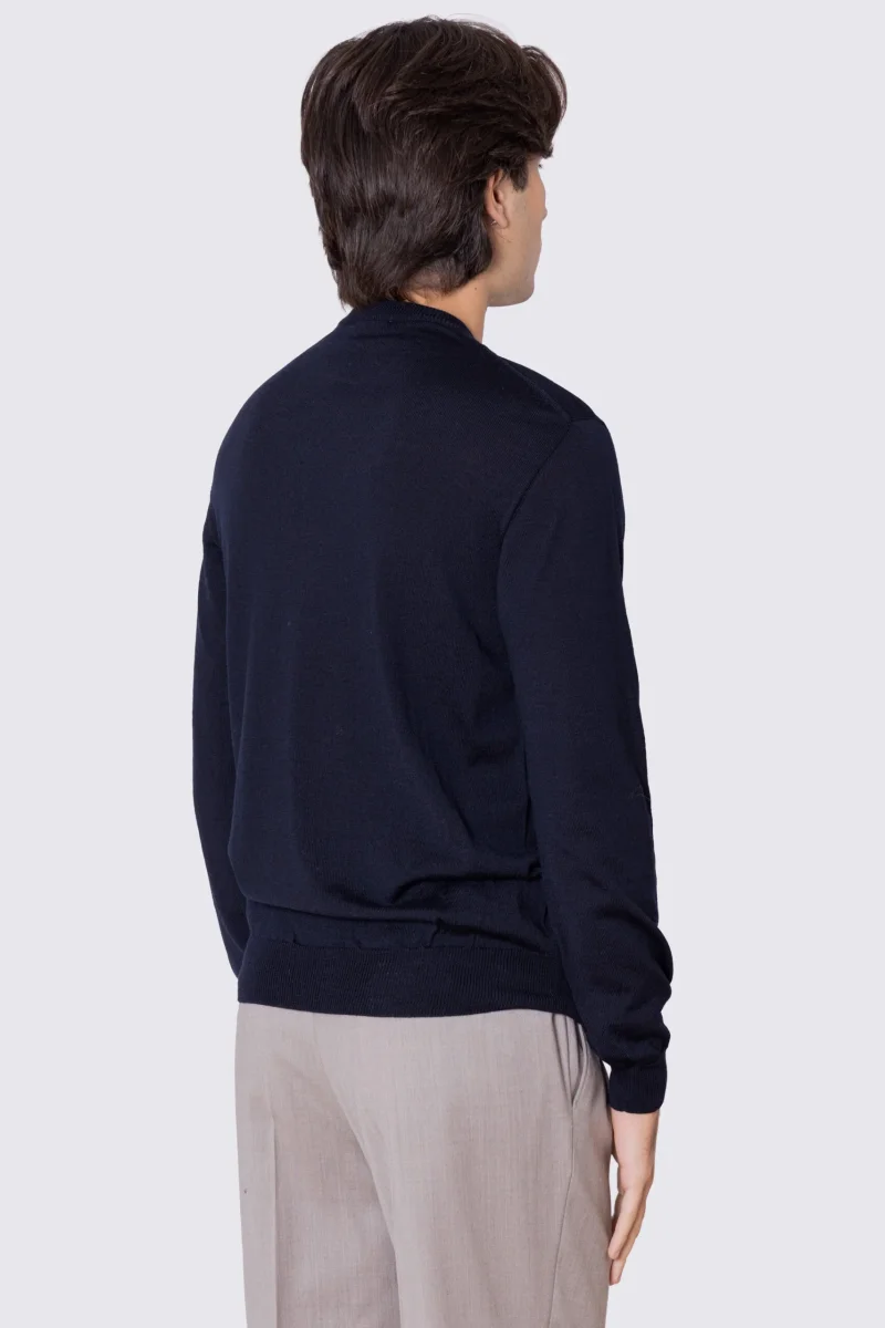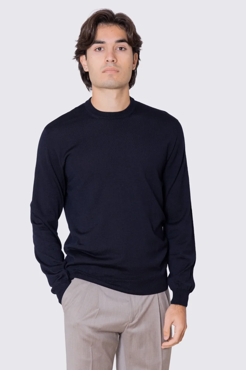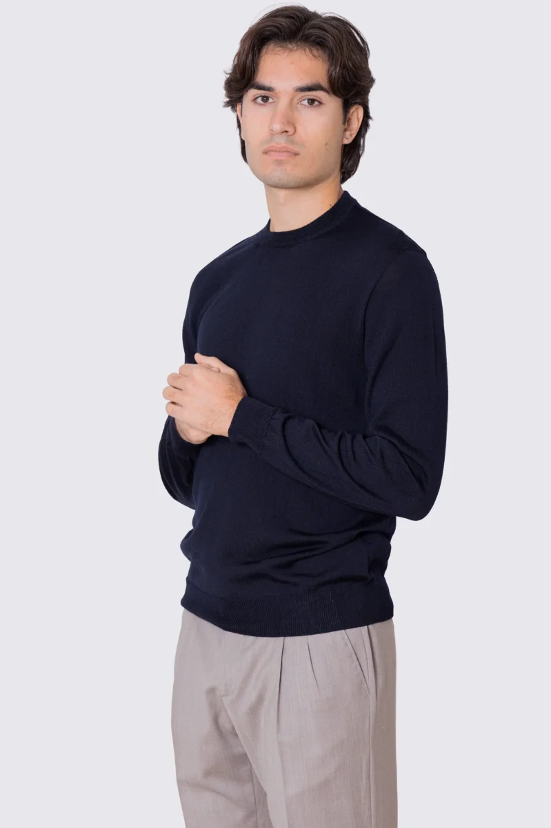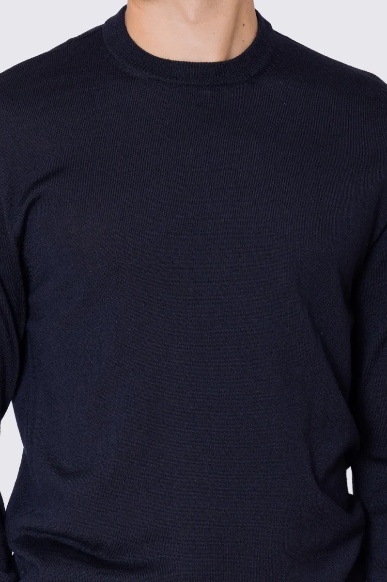 Maglione girocollo Blu notte in lana merinos 100% costruzione tubolare senza cuciture rifinito a mano tinta unita con elastici sulle maniche e sul fondo Finezza 12