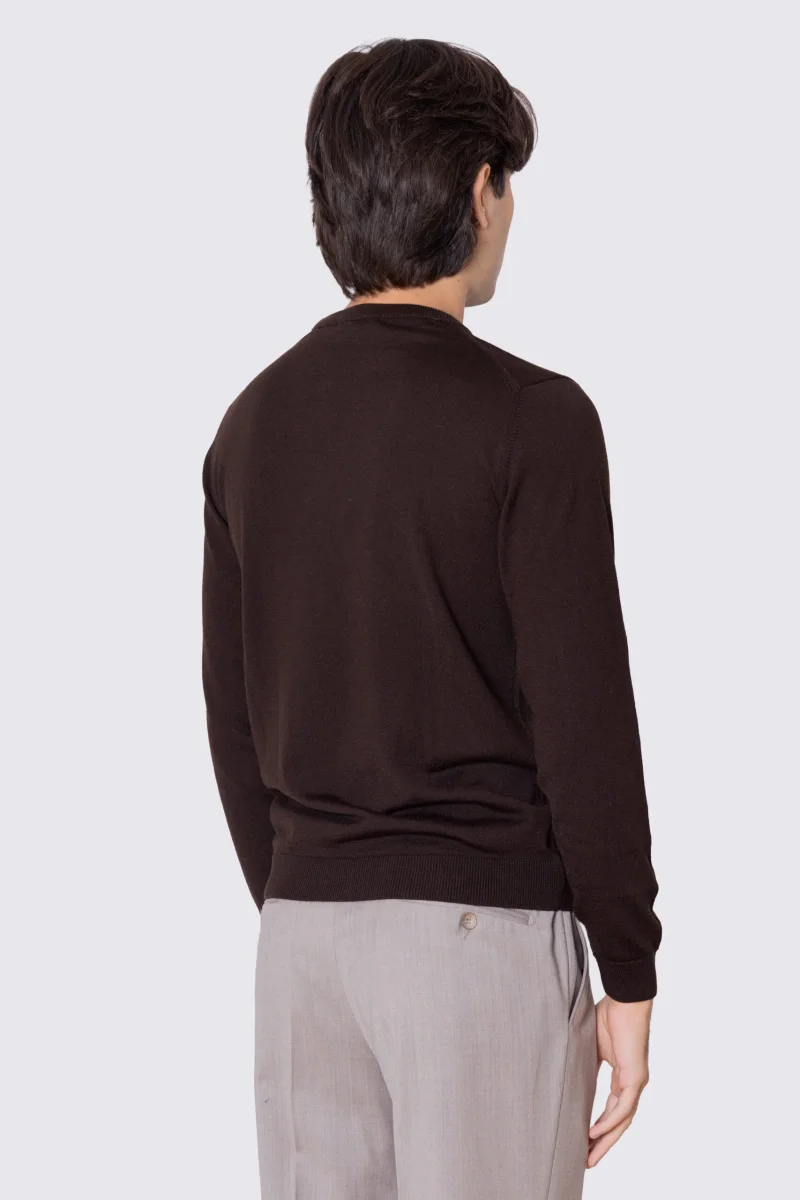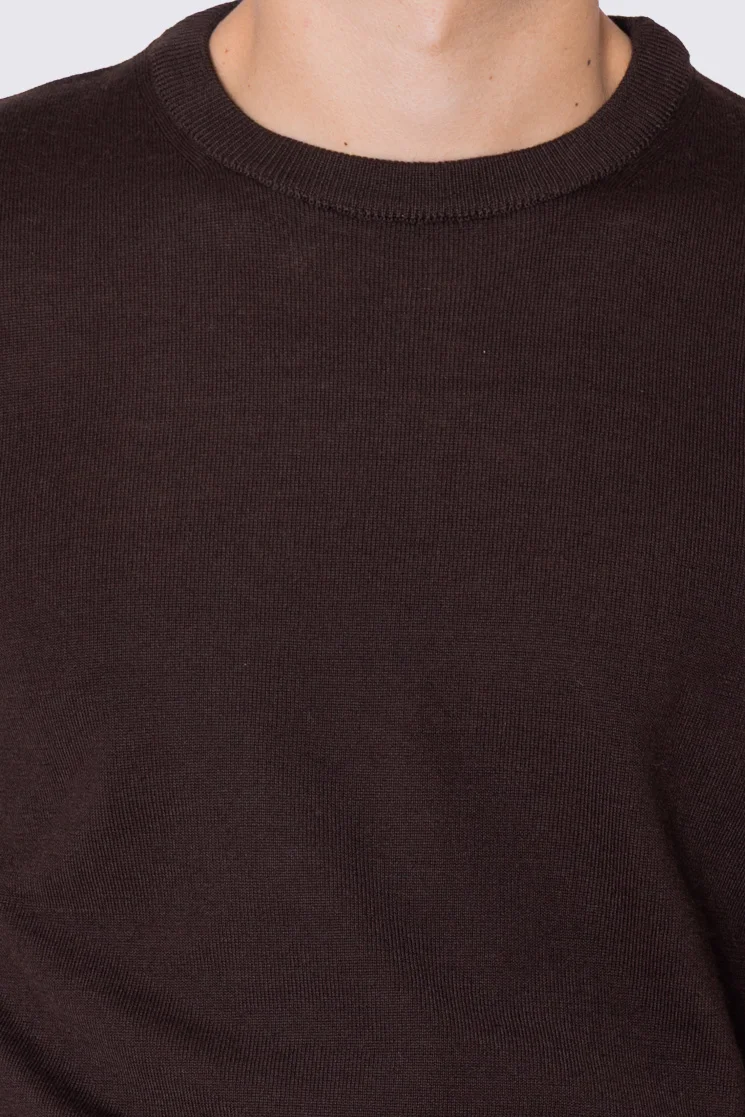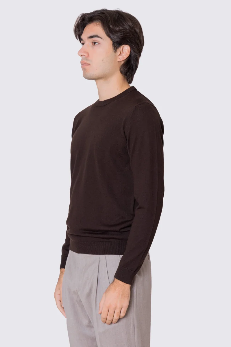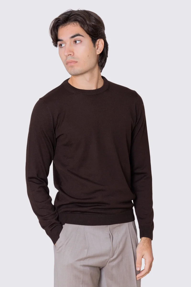 Maglione girocollo Marrone in lana merinos 100% costruzione tubolare senza cuciture rifinito a mano tinta unita con elastici sulle maniche e sul fondo Finezza 12