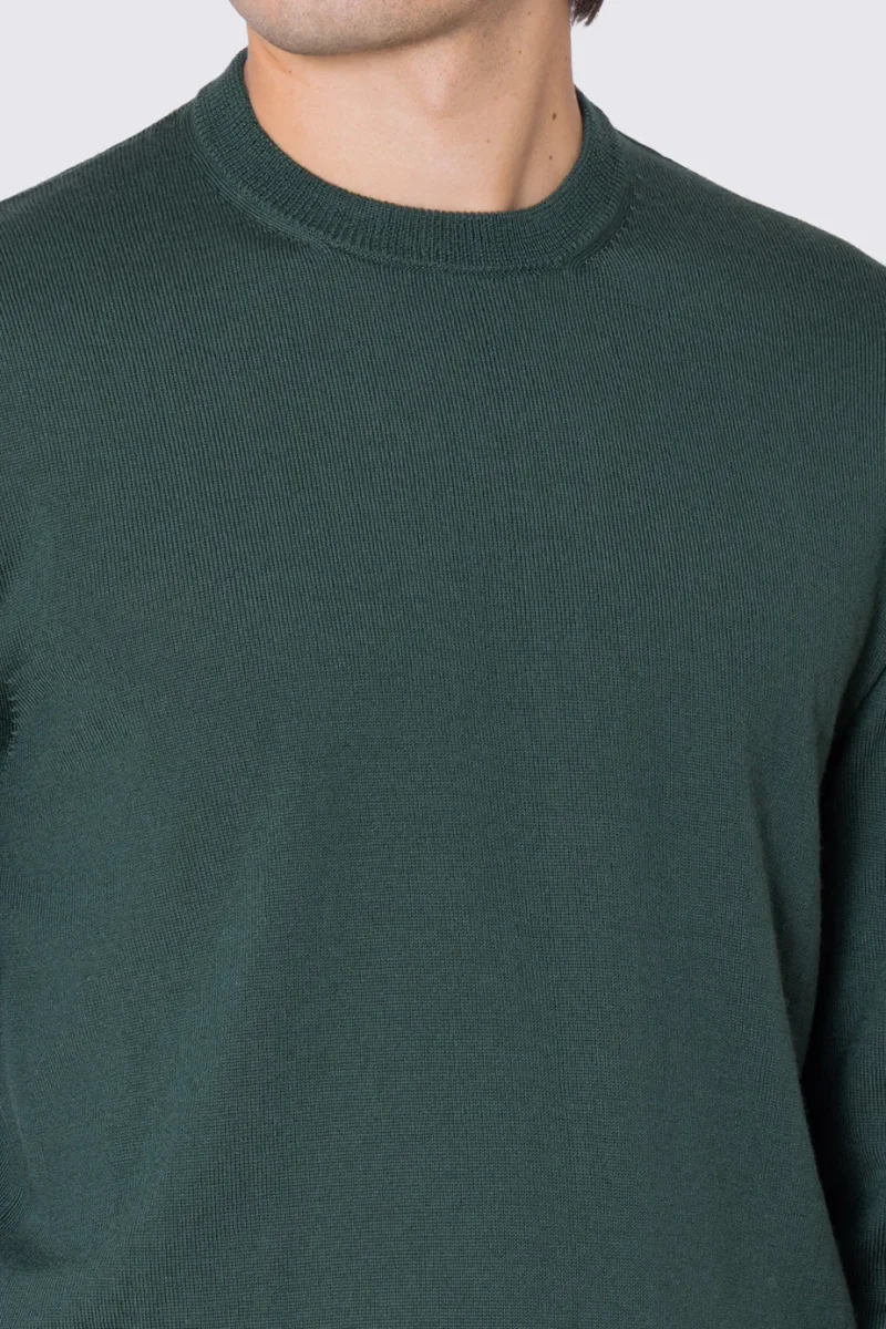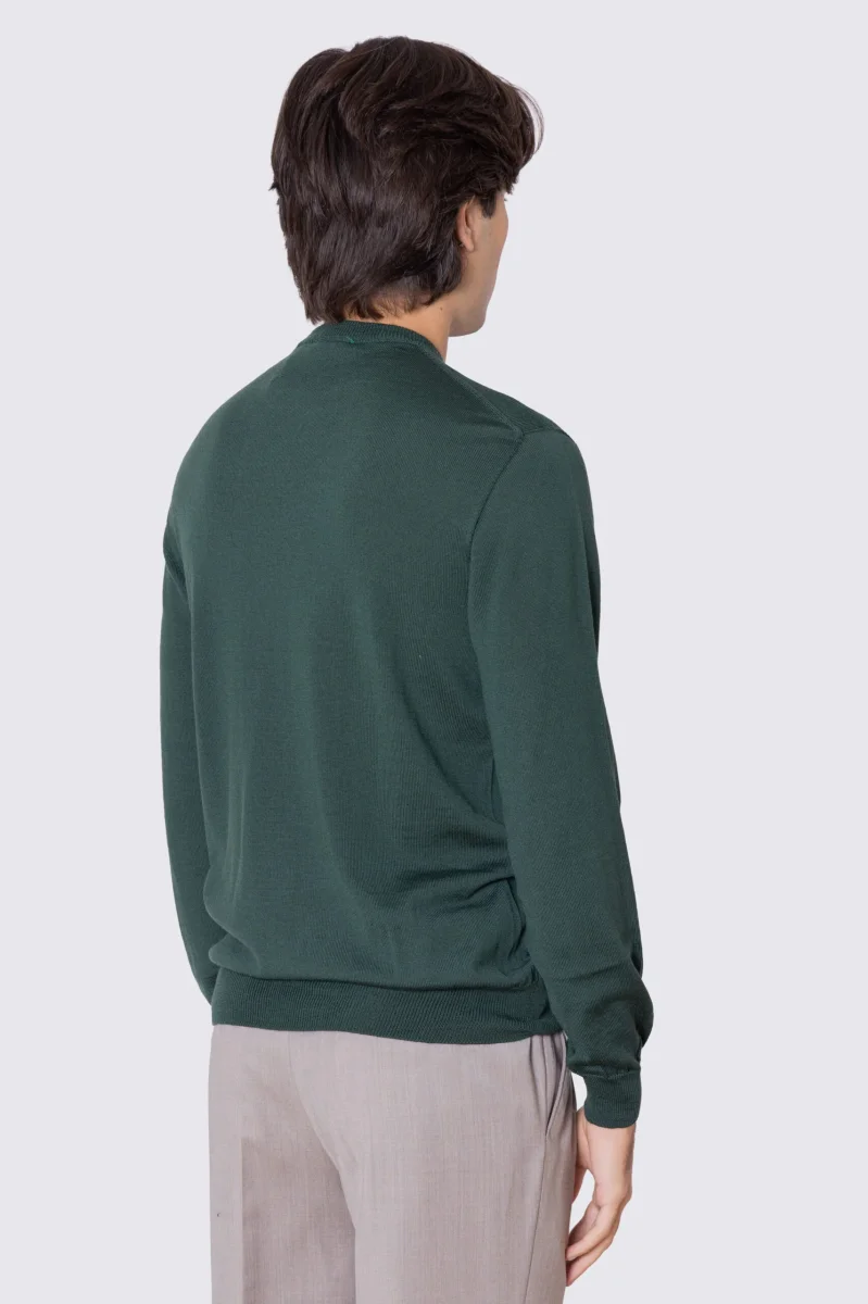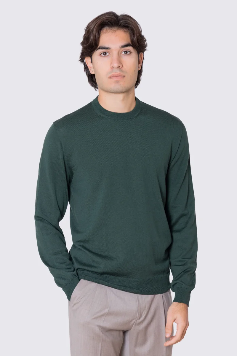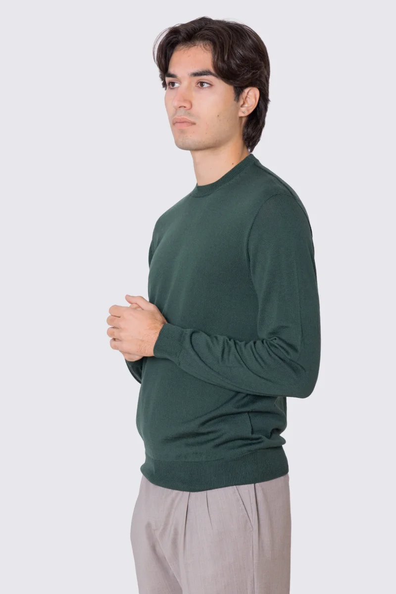 Maglione girocollo verde in lana merinos 100% costruzione tubolare senza cuciture rifinito a mano tinta unita con elastici sulle maniche e sul fondo Finezza 12