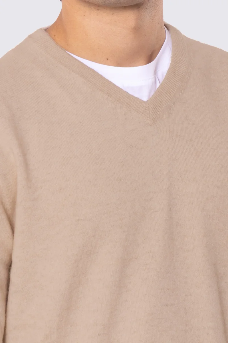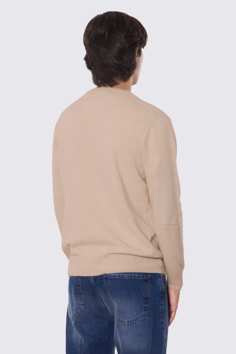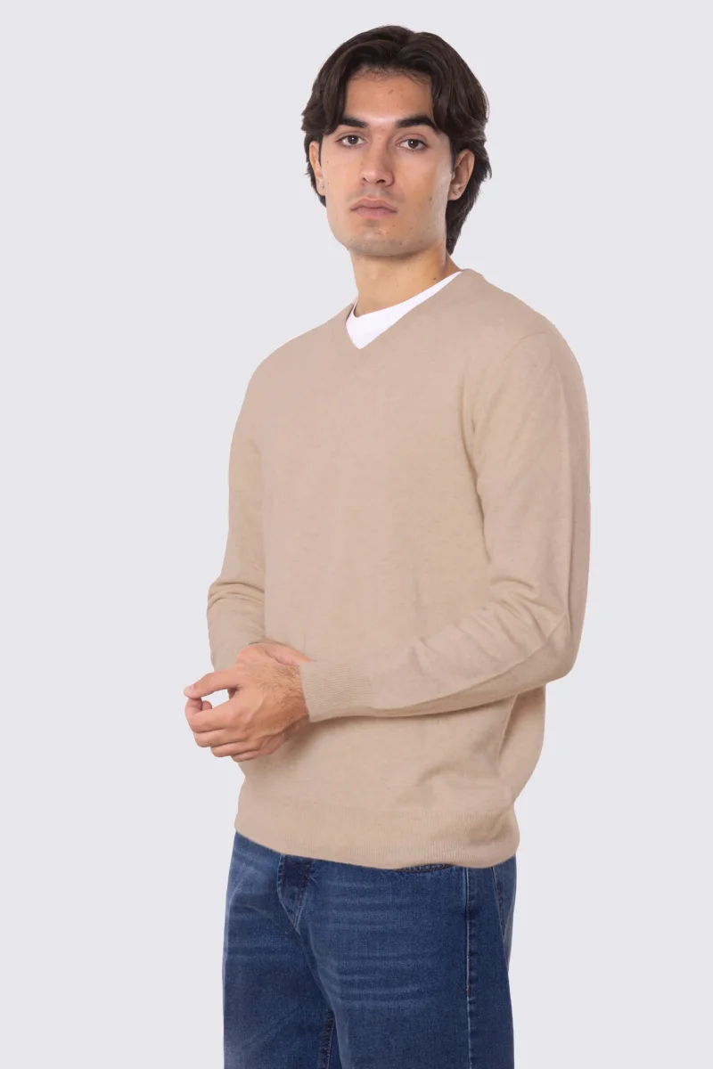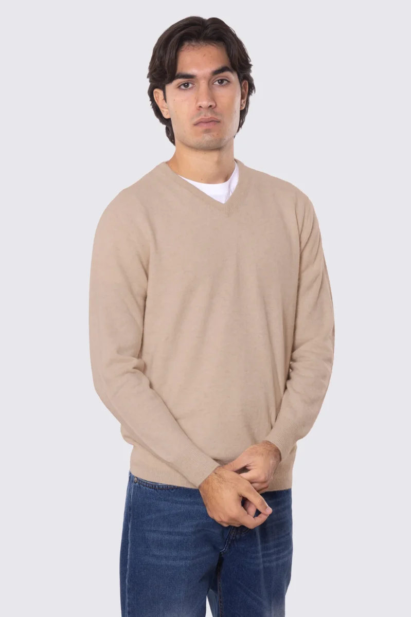 Maglione scollo a v color cammello 100% cashmere a tubolare tinta unita con elastici sulle maniche e sul fondo Finezza 12