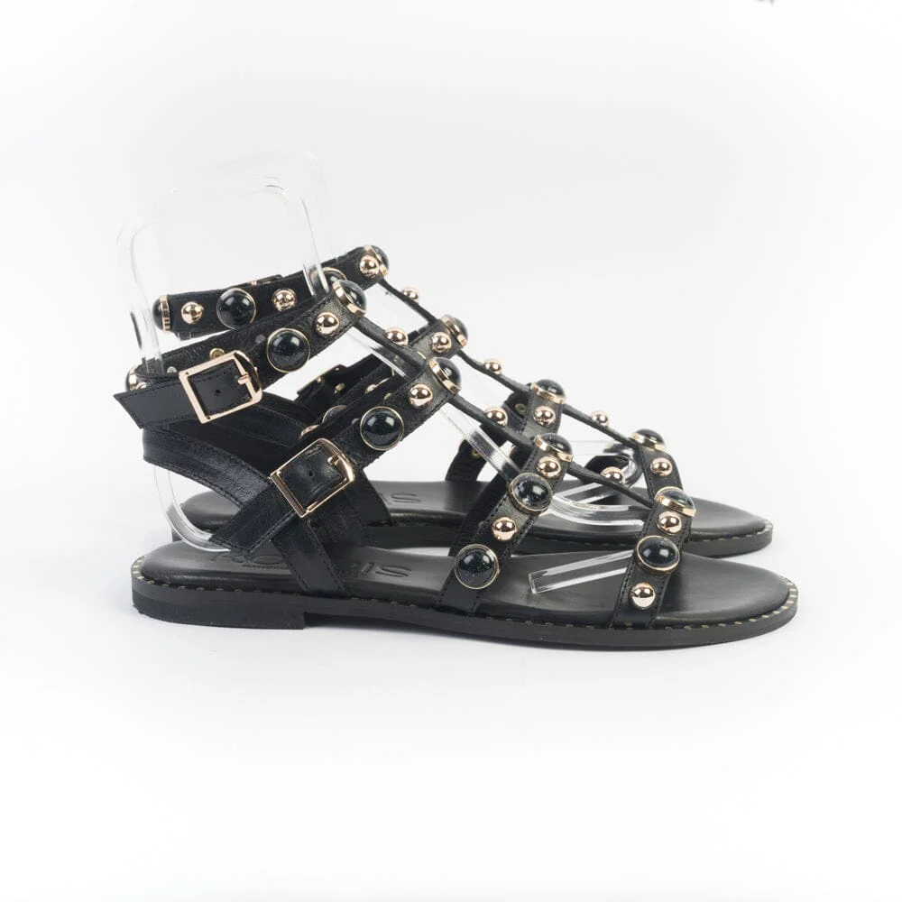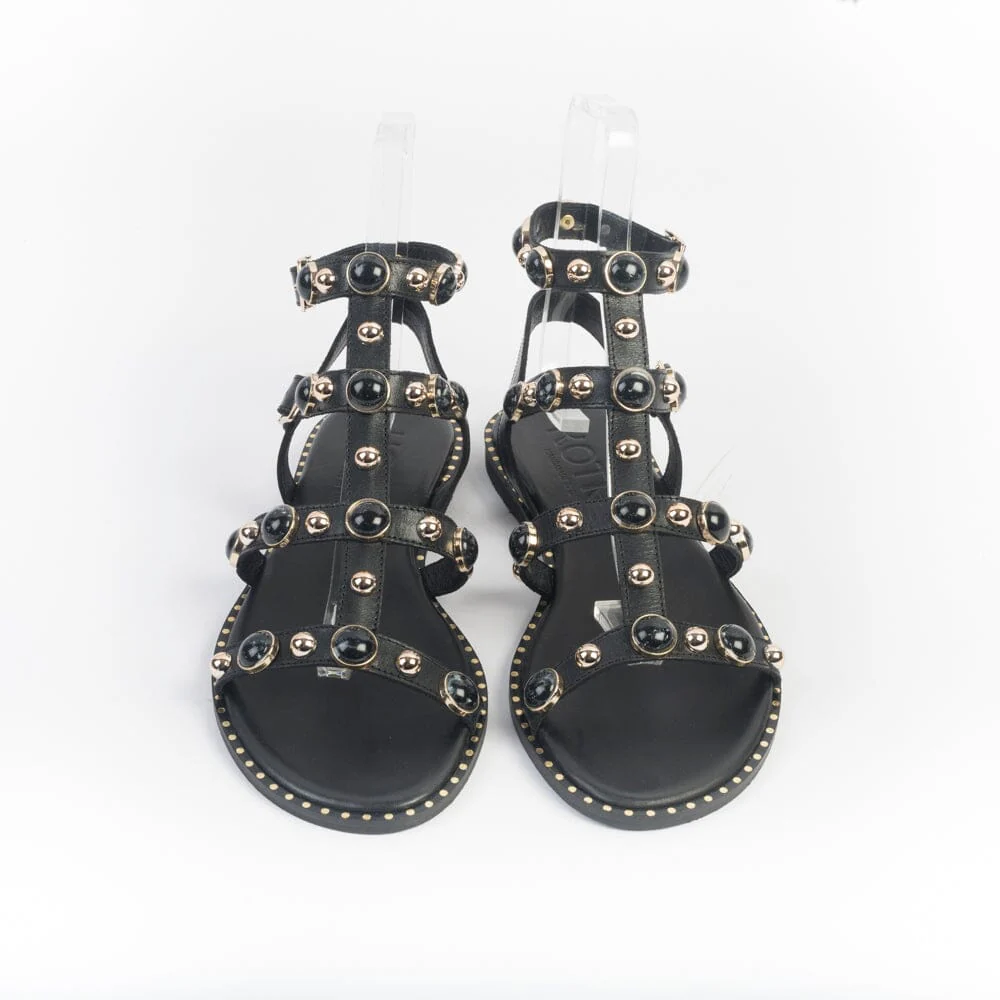 Sandali di MAKIS KOTRIS, realizzati in pelle di vitello di colore nero, con borchie con pietra di colore nero e oro sulle fascette della tomaia. Sottopiede imbottito per un maggiore comfort nella calzata. Chiusura con doppio cinturino regolabile alla caviglia e uno a lato collo del piede. Borchie di finitura di colore oro su bordo esterno. Suola in cuoio e tacco gomma.