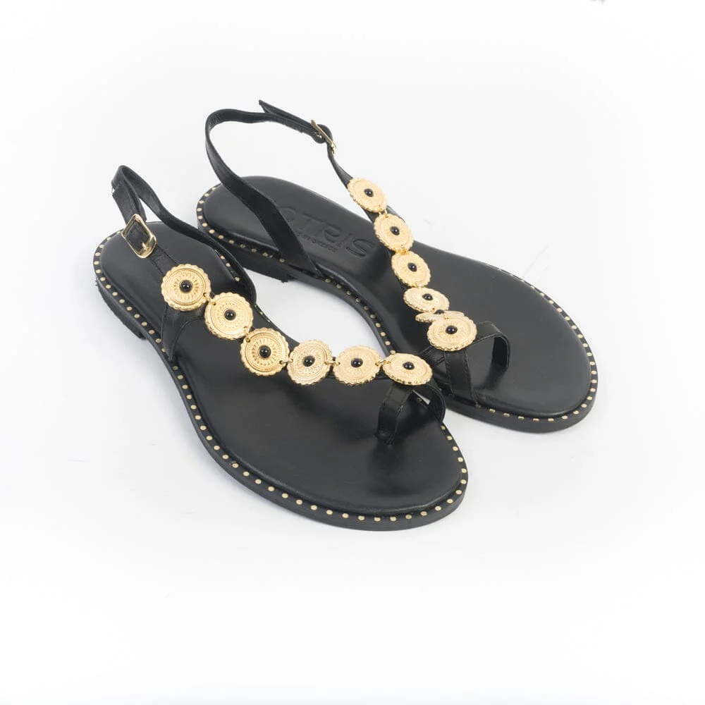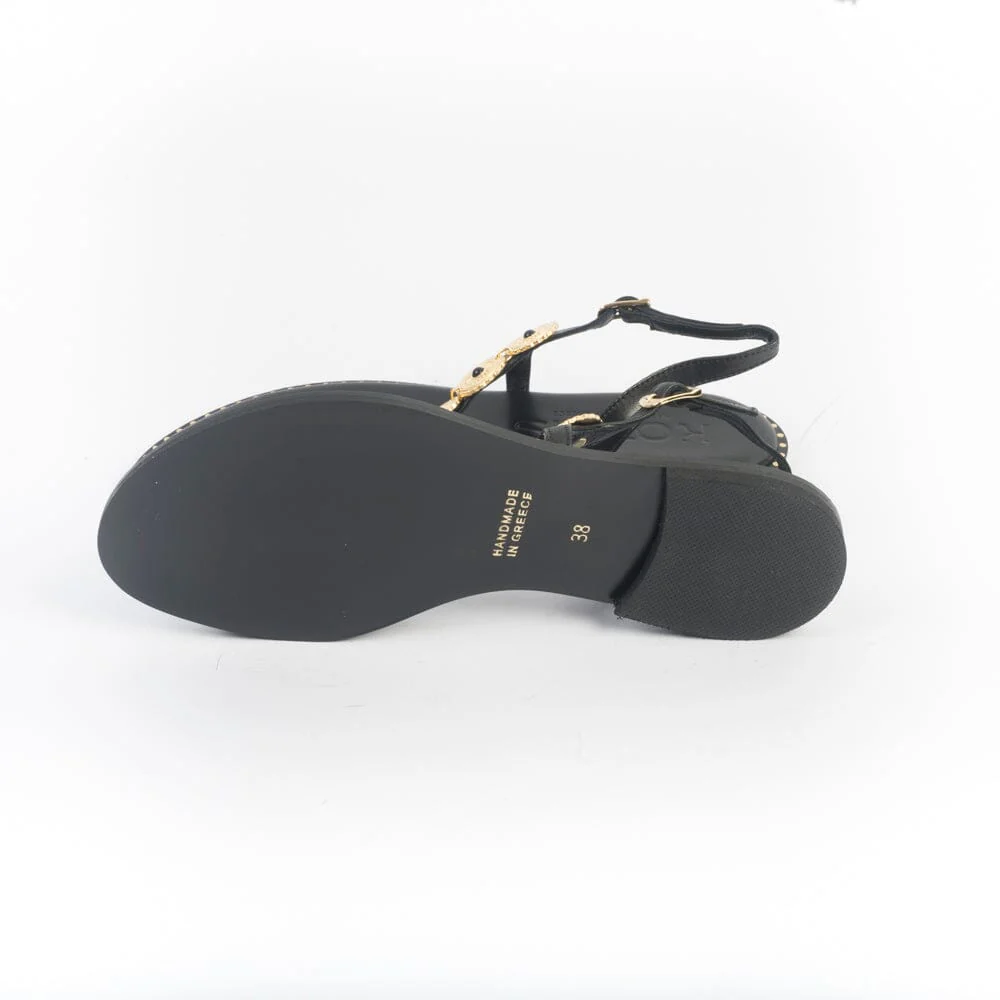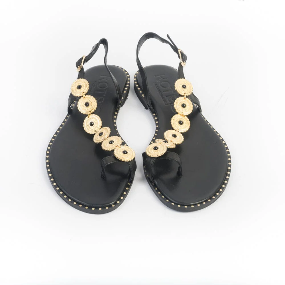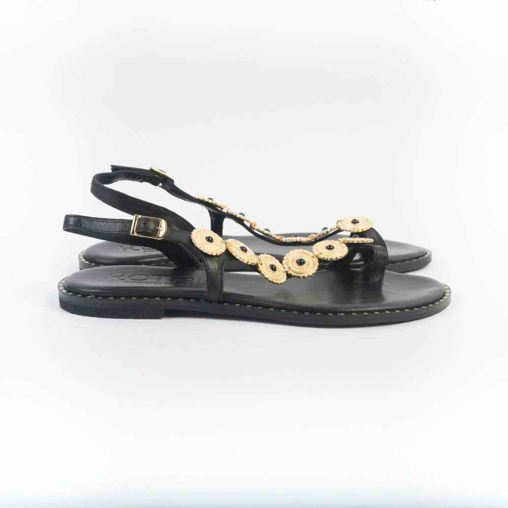 Sandali infradito MAKIS KOTRIS, realizzati in pelle di vitello di colore nero, decorato con accessorio a forma di moneta oro con pietra nera su collo del piede. Chiusura con cinturino regolabile alla caviglia. Sottopiede imbottito per un maggiore comfort nella calzata e borchie di finitura di colore oro su bordo esterno. Suola in cuoio e tacco gomma.