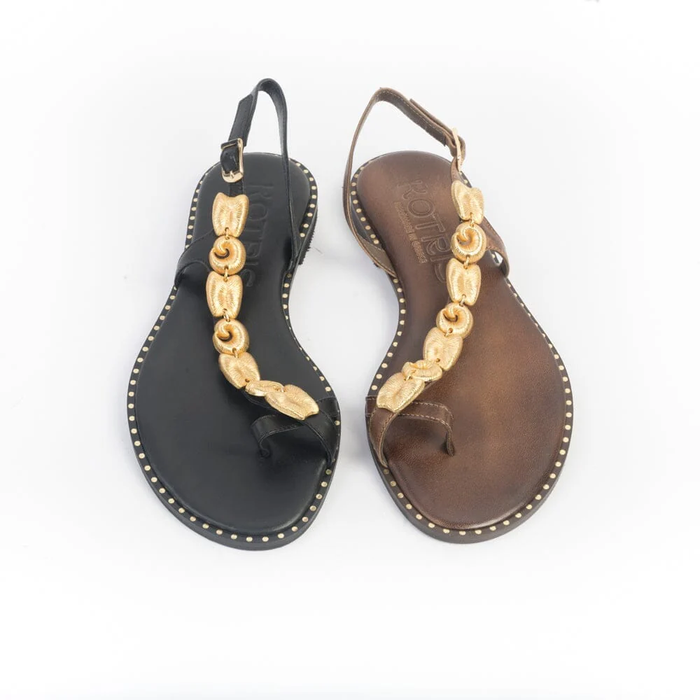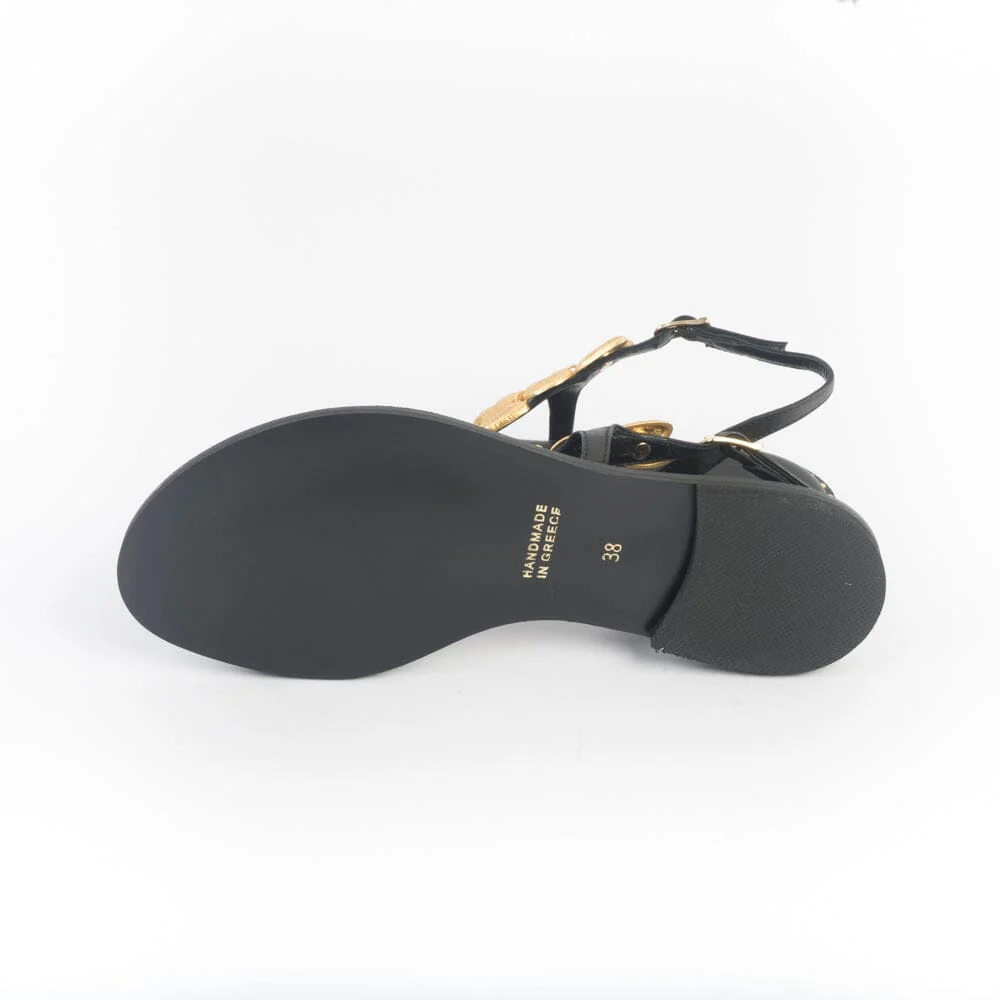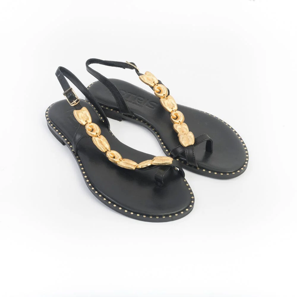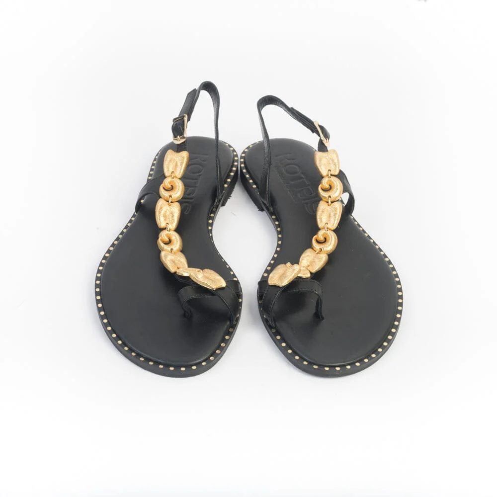 Sandali infradito MAKIS KOTRIS, realizzati in pelle di vitello di colore nero, decorato con accessorio dorato su collo del piede. Chiusura con cinturino regolabile alla caviglia. Sottopiede imbottito per un maggiore comfort nella calzata e borchie di finitura di colore oro su bordo esterno. Suola in cuoio e tacco gomma.