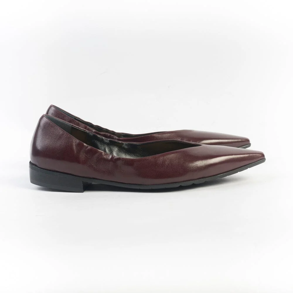 Ballerine artigianali di Mara Bini realizzate in morbidissima pelle di vitello liscia di colore vinaccia con punta affusolata. Elastico su ambi i lati per un maggiore comfort della camminata. Interno foderato in pelle di colore ocra e suola in gomma antiscivolo con tacco di altezza cm 2.