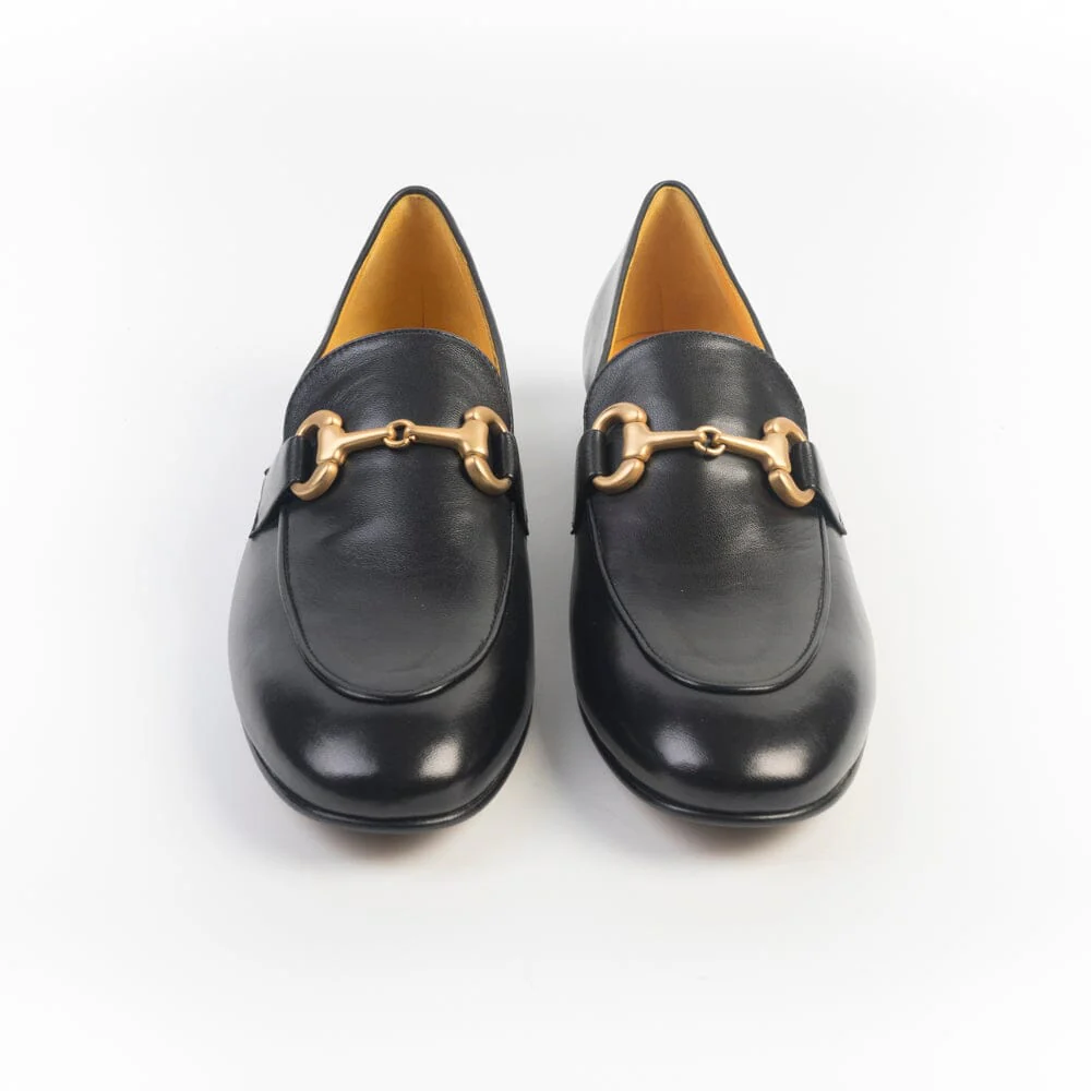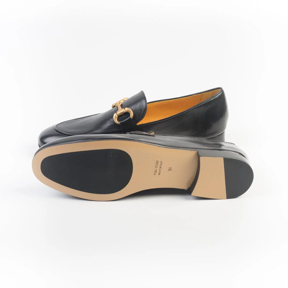 Mocassini artigianali di Mara Bini realizzate in morbida pelle di vitello liscia di colore nero con applicazione di morsetto in metallo sul collo del piede, di colore oro brunito. Punta affusolata con cucitura a rilievo su tomaia davanti. Interno foderato in pelle colore ocra e soletto in nuance. Suola in cuoio con inserto gomma antiscivolo. Tacco di altezza cm 1,5.
