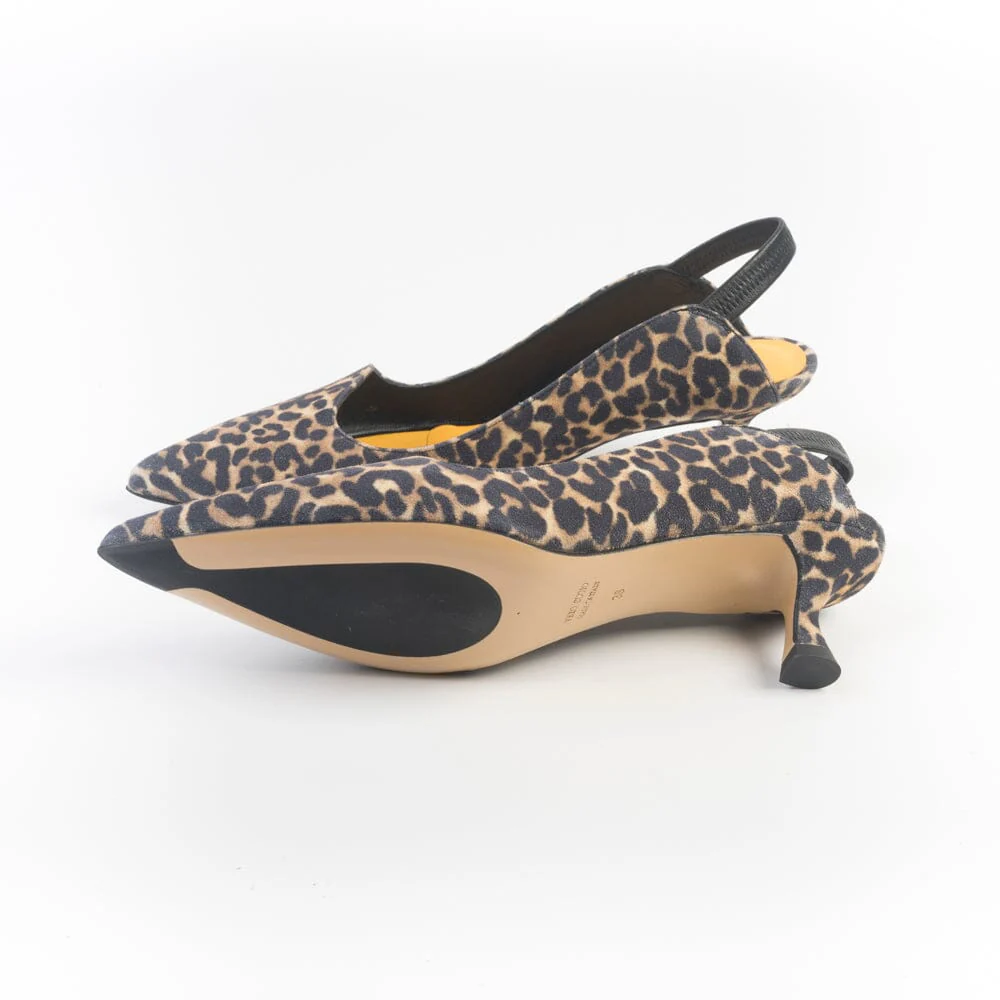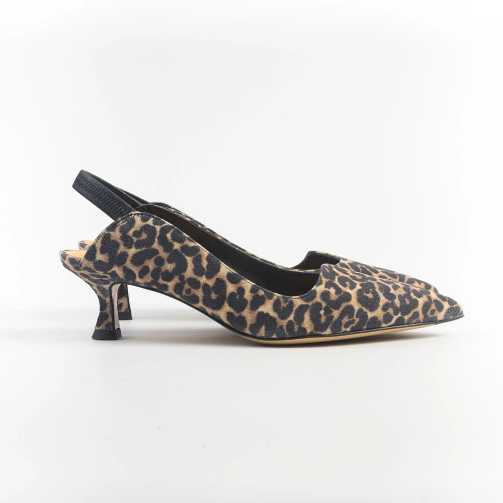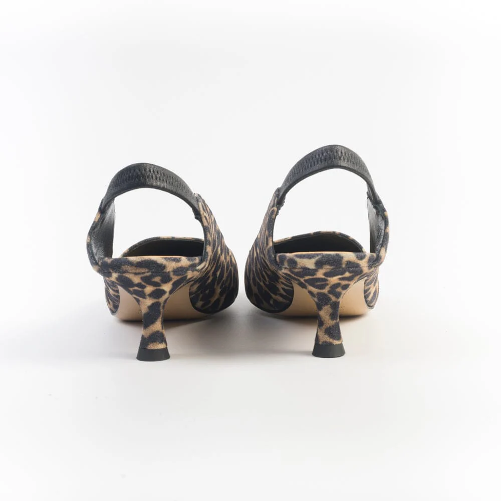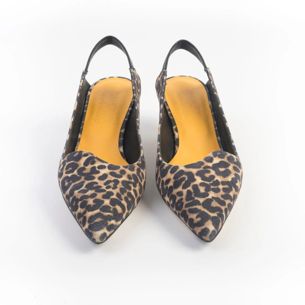 Comode Sling Back di Mara Bini realizzate in morbido camoscio nei colori marrone nero e cuoio a macchia di leopardo con fascia elastica sul retro. Soletto interno in pelle di colore oca e tacco rocchetto, rivestito in camoscio, di altezza 5 cm circa. Suola in cuoio con inserto in gomma antiscivolo.
