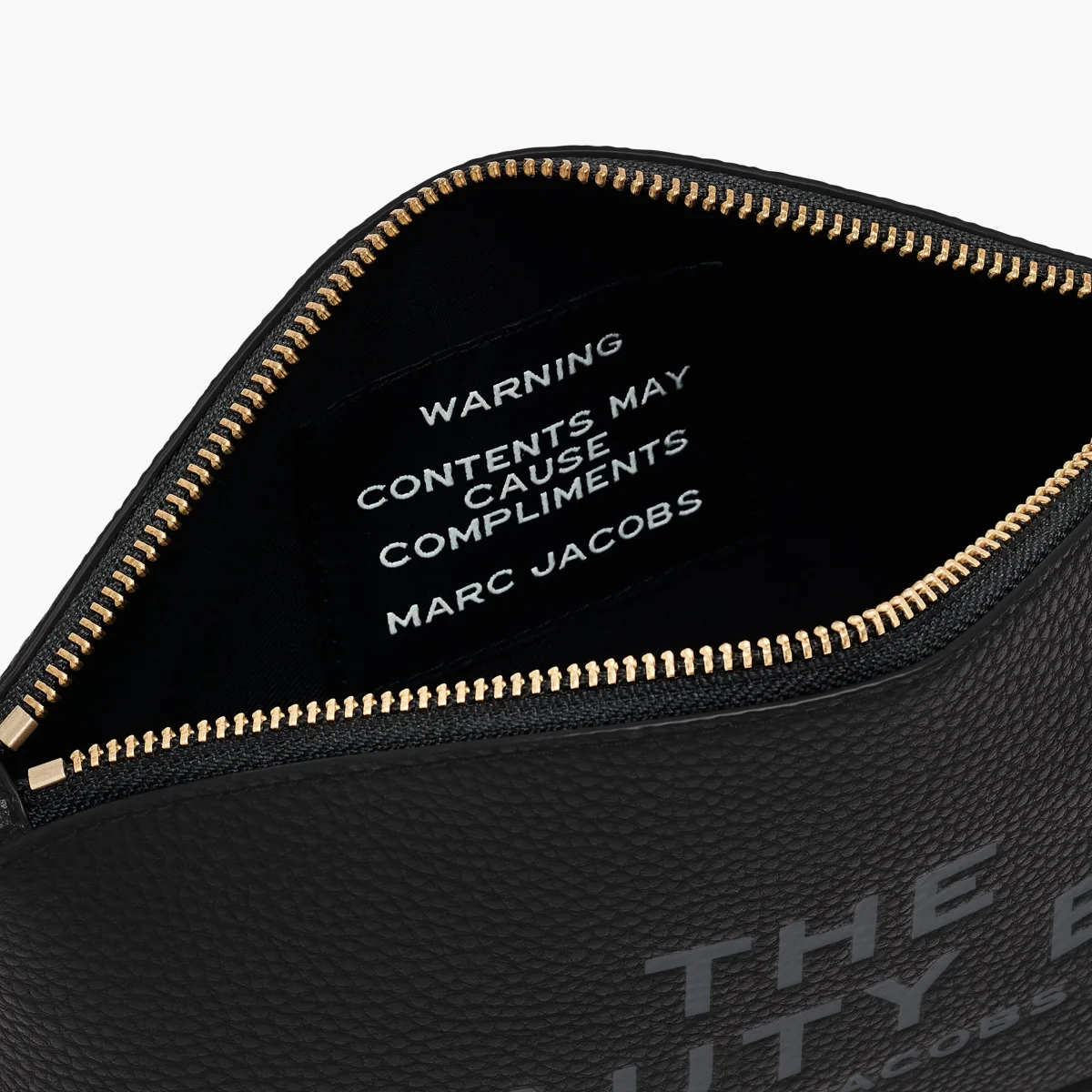 Originale beauty case di Marc Jacobs, realizzato in pelle martellata di colore nero. Interno foderato in tessuto di colore nero. Chiusura con zip in metallo brunito e tiretto in pelle. Dotata di polsiera removibile.