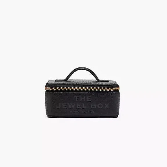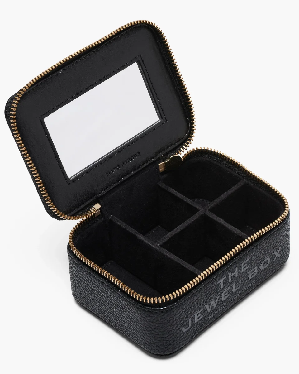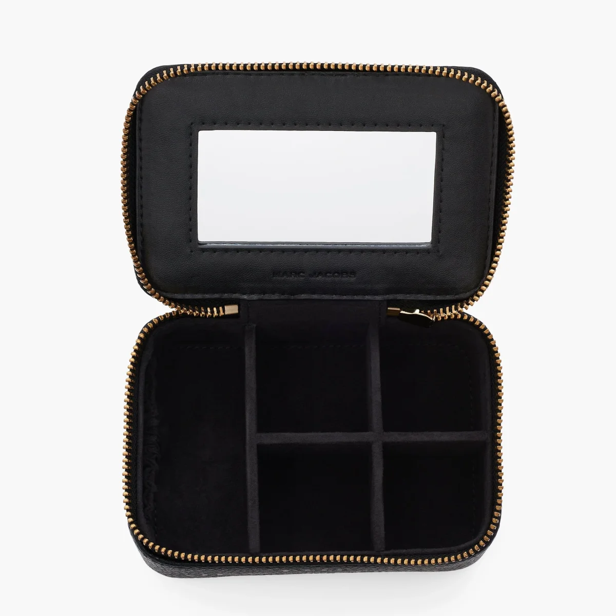 Piccolo box di Marc Jacobs, realizzato in pelle martellata di colore nero. Originale forma squadrata con interno foderato in tessuto in nuance. Unica zip di chiusura. Logo del brand in nuance sulla parte frontale dell’astuccio. All’interno, un piccolo specchio, cinque scomparti strutturati e una tasca elastica per contenere i tuoi gioielli.