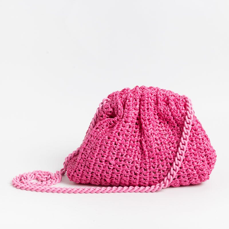 Originale borsa a tracolla di Maria La Rosa, realizzata a mano in rafia crochet di colore fuchsia. Fodera interna in tessuto di viscosa nel colore oro. Tracolla a catena in metallo in nuance. Chiusura a scatto.