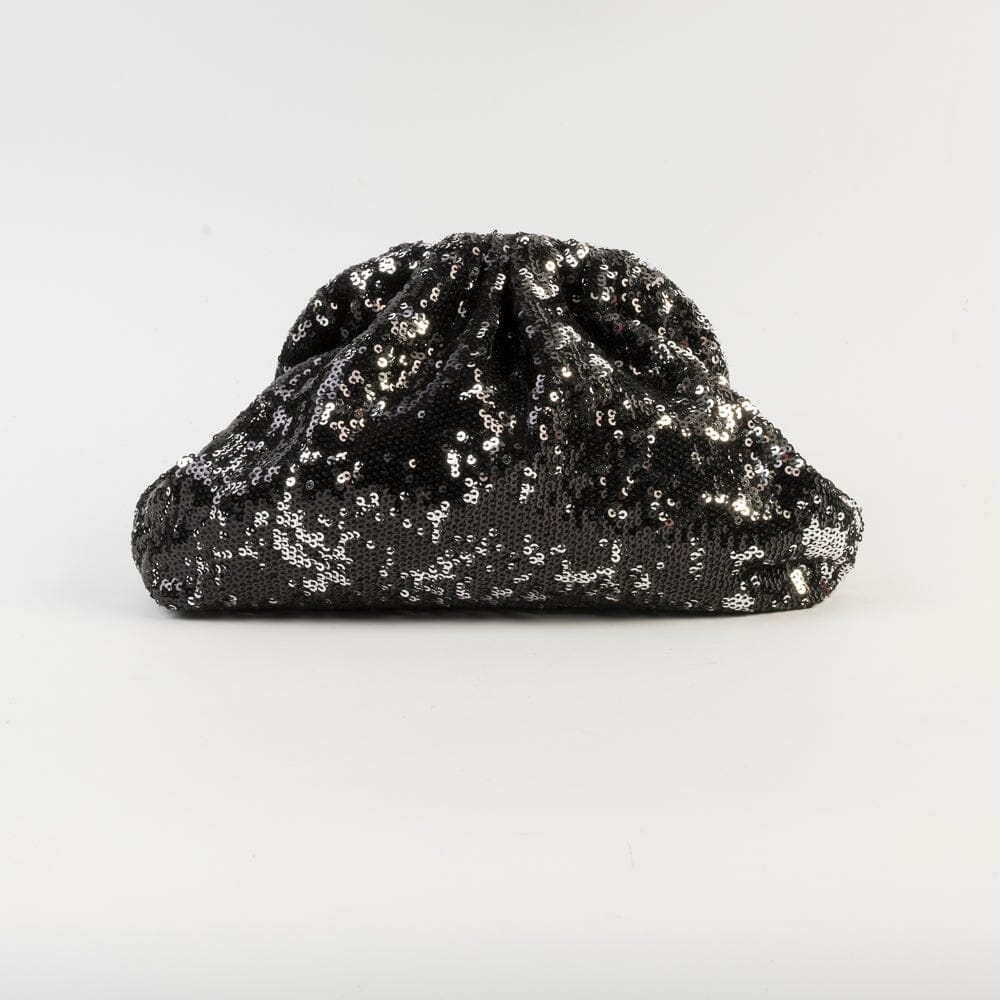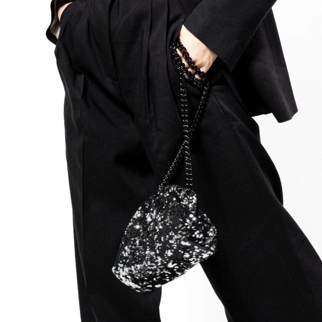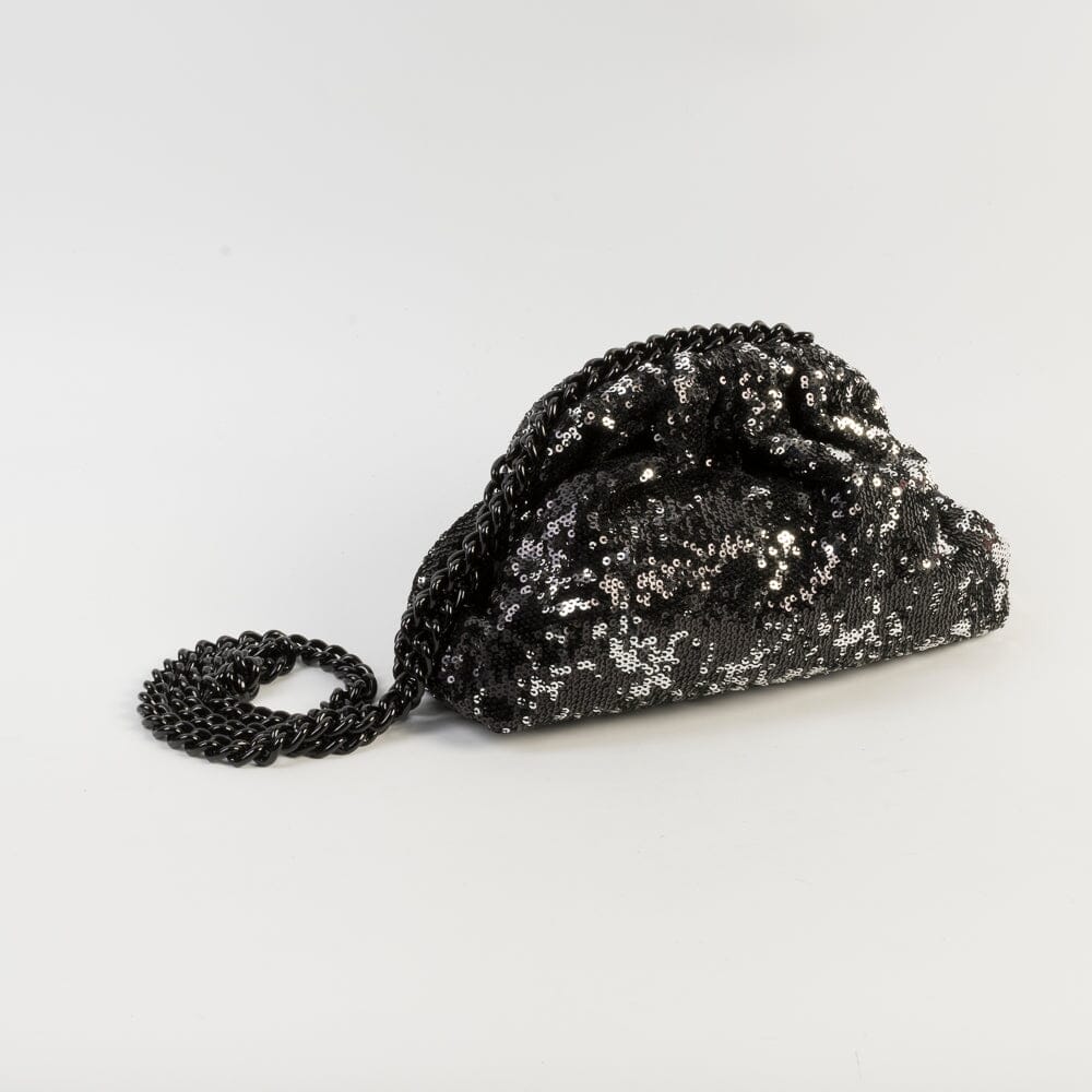 Originale borsa a tracolla di Maria La Rosa, realizzata a mano in tessuto con applicazione di paillettes di colore nero ed argento. Fodera interna in tessuto di viscosa di colore oro .Tracolla a catena in metallo in nuance. Chiusura a scatto.