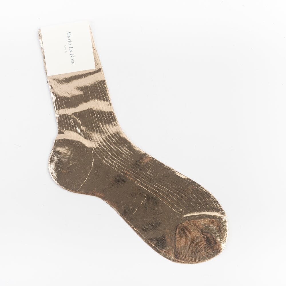 Calza di Maria La Rosa realizzata in pregiata seta laminata di colore bruciato. Ideale per tutte le stagioni nonostante siano realizzati in leggerissimo materiale isolante rendendolo fresco d’estate e caldo d’inverno. Il calzino è stato ricoperto da una finitura metallica che dopo diversi lavaggi tende a scomparire lasciando emergere la brillantezza della seta.