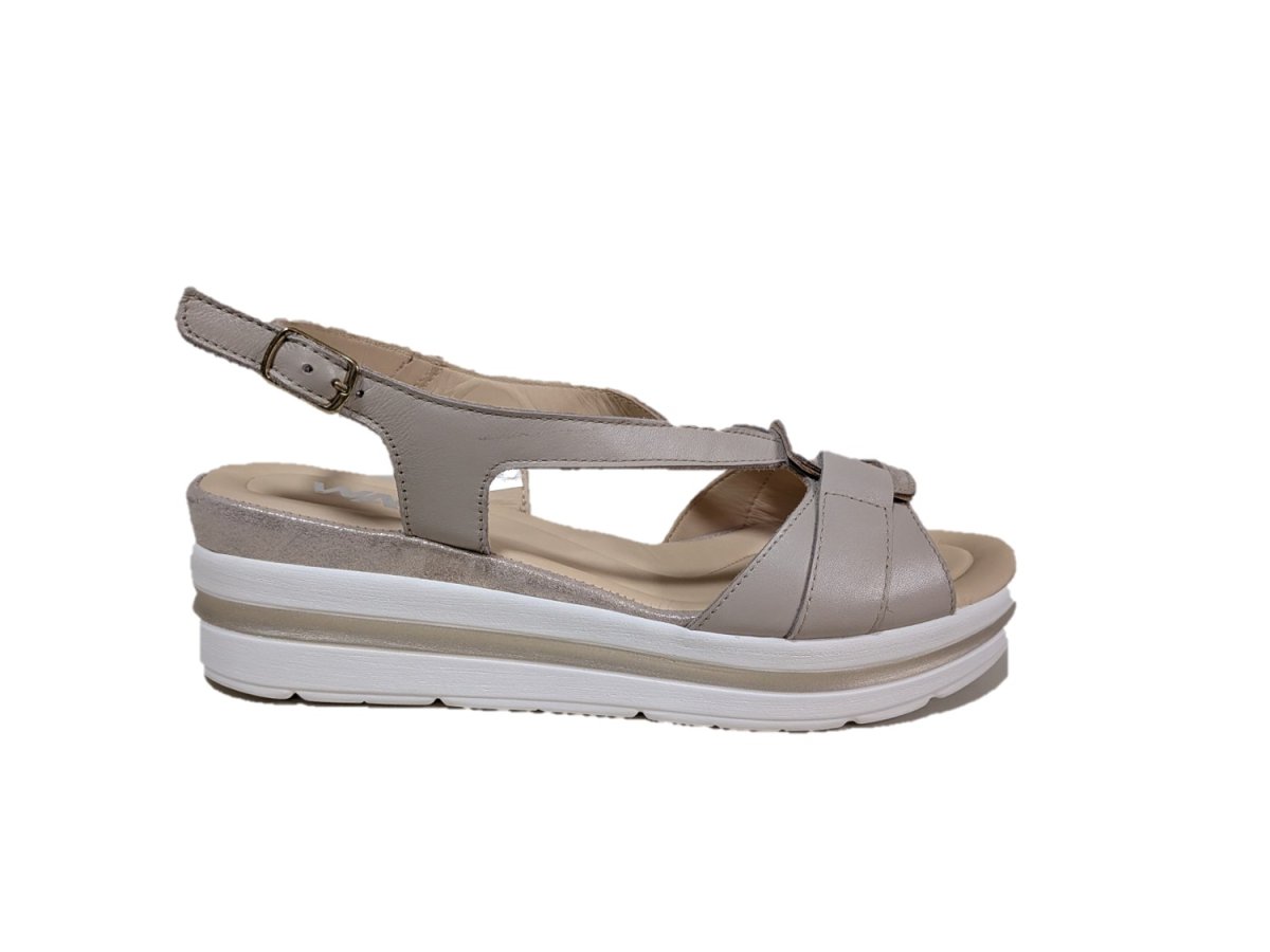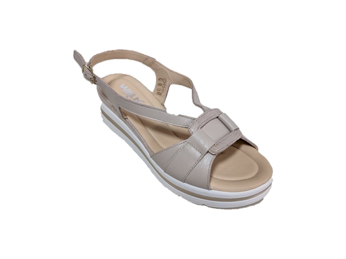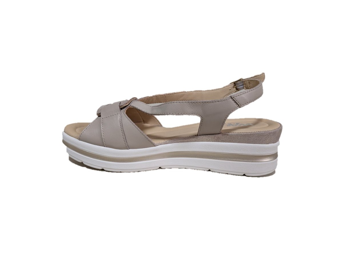 Sandalo in pelle colore latte macchiato, zeppa 5,5, suola in gomma, allacciatura con la fibbia