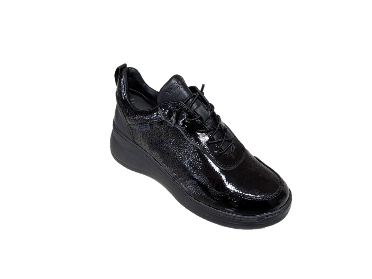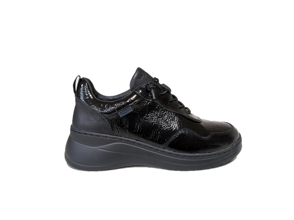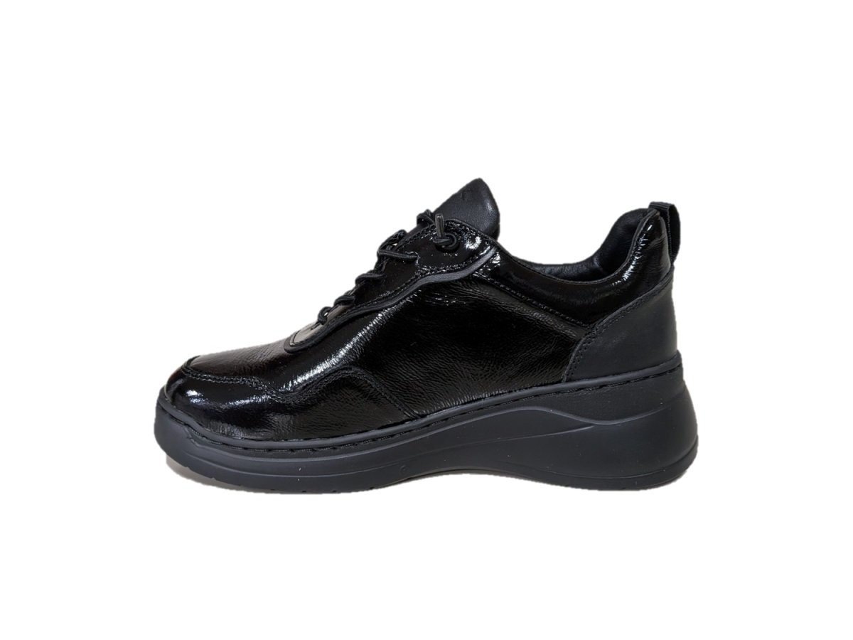 Sneakers in pelle lucida colore nero, zeppa di 5cm, suola in gomma, fodera in pelle e tessuto