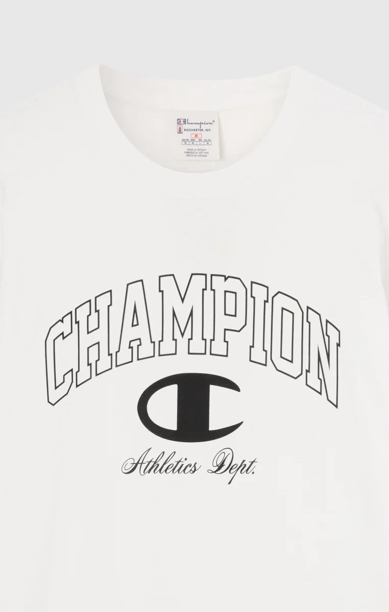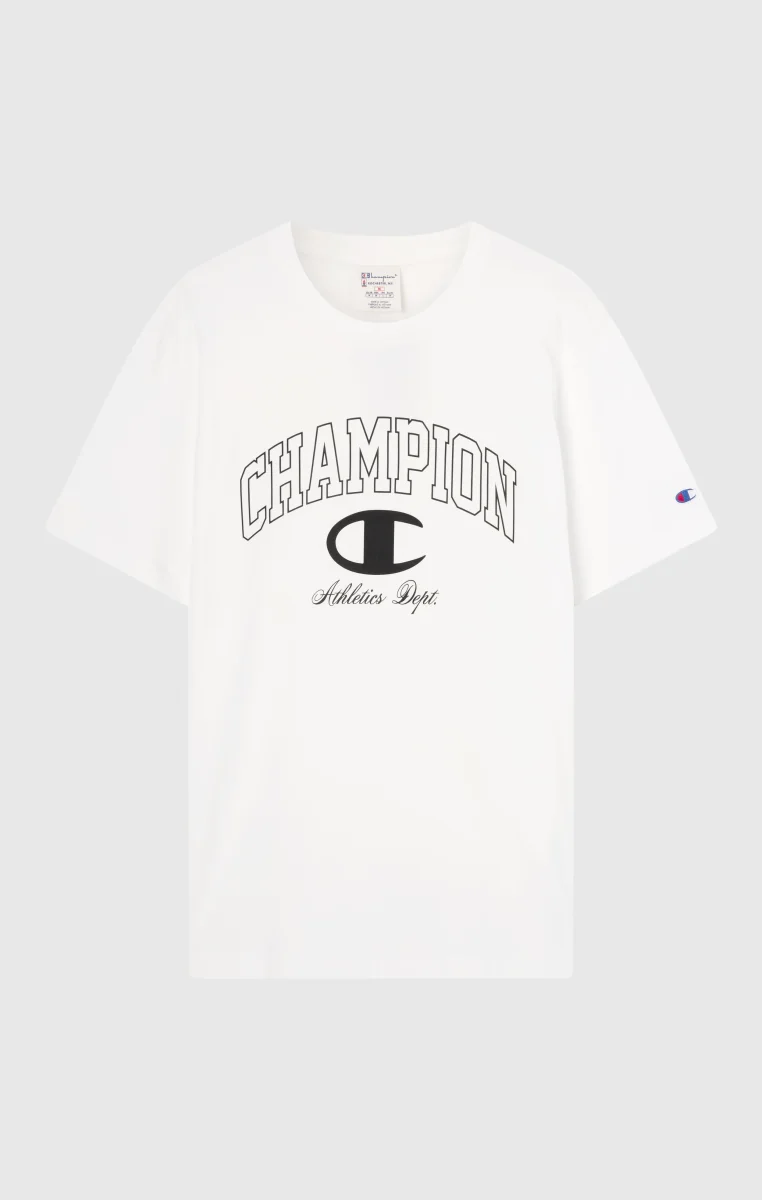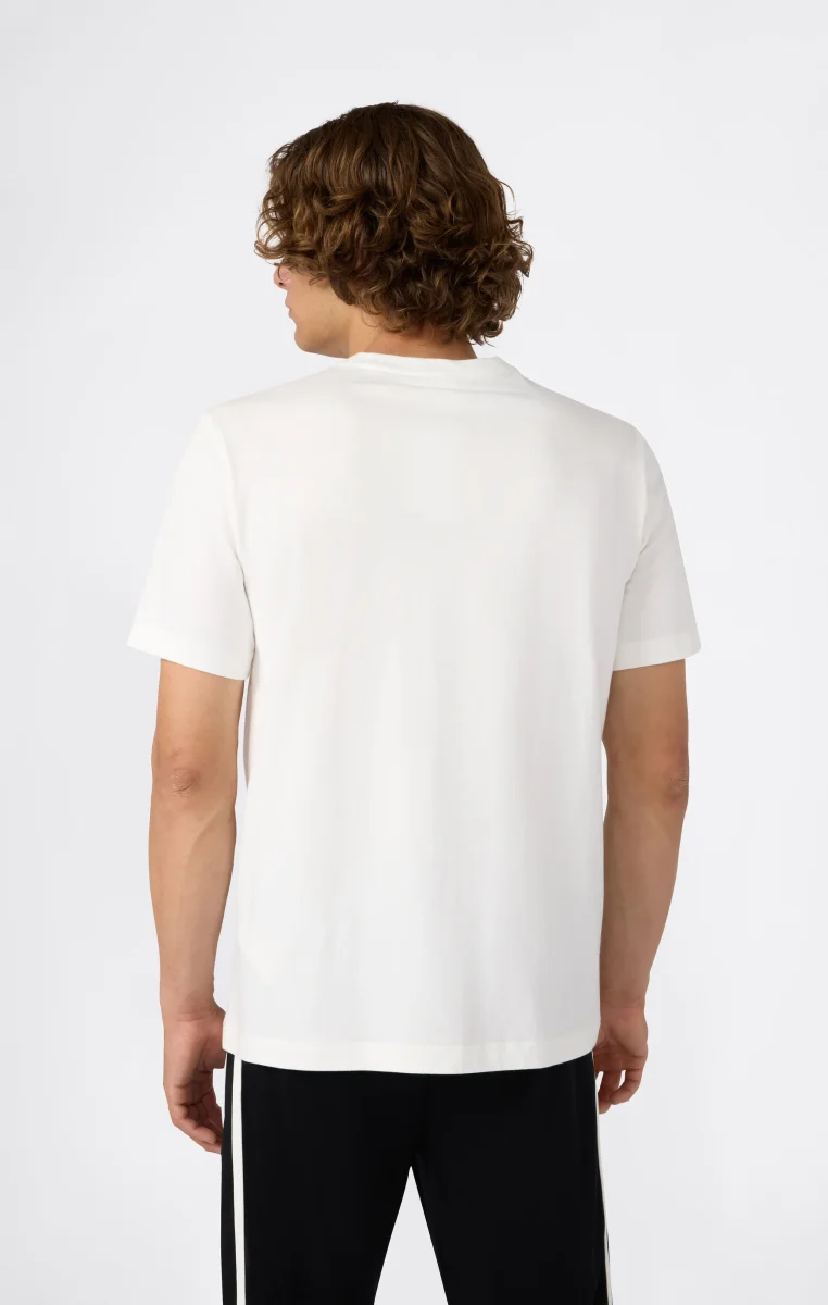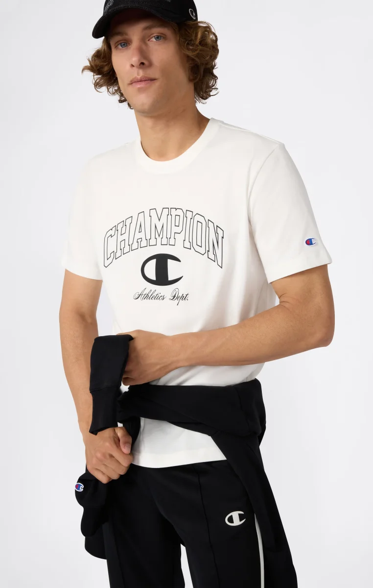 Soft lines and college-style graphics define this crewneck T-shirt, made from compact combed cotton jersey. Its comfortable fit makes it perfect for a relaxed street look, enhanced by the large front logo inspired by American varsity style with a modern twist.@@@Fabric: Compact combed cotton jersey, weight: 200 g/m² |Composition: 100% Cotton |College-style front graphic |Ribbed collar |Fit: Relax Fit – Relaxed and comfortable fit, slightly roomy at the chest, dropped shoulder, regular length.