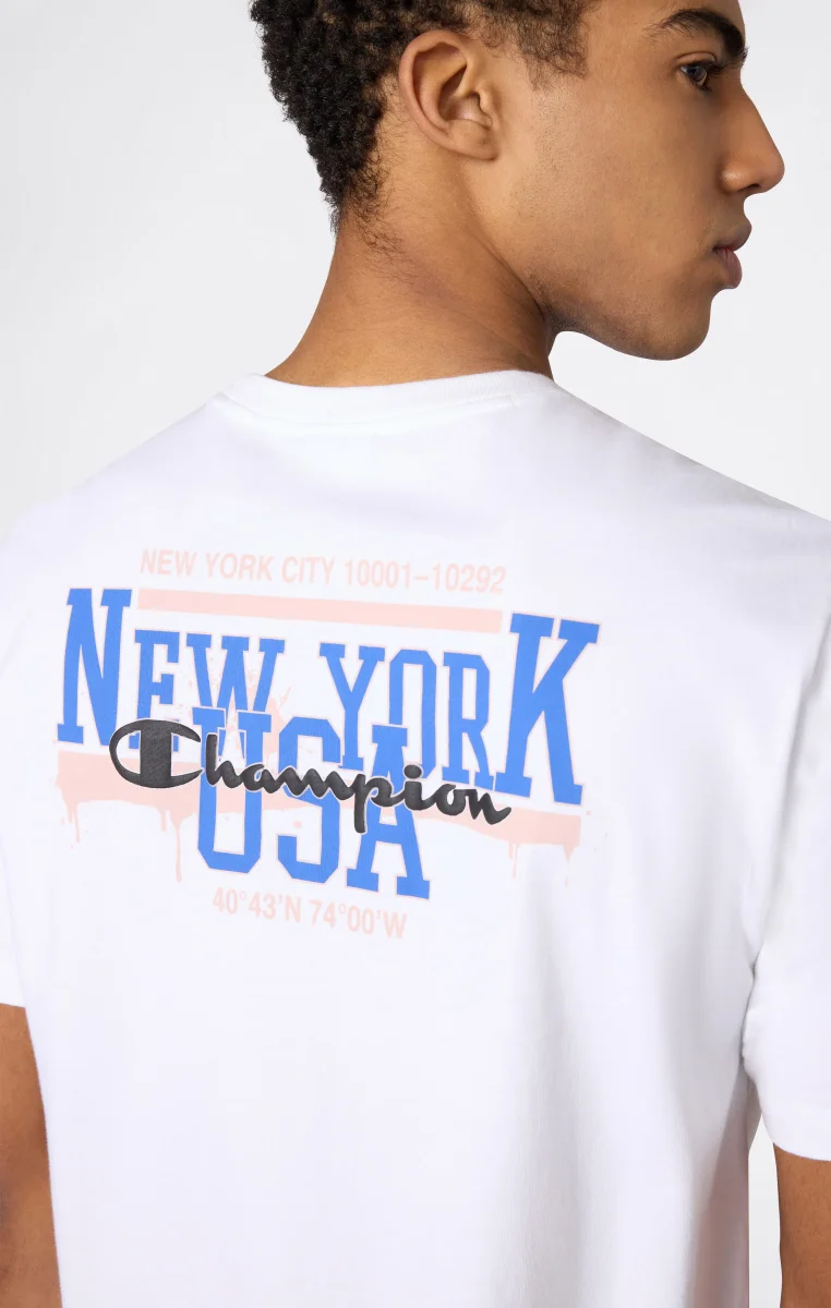 Men’s crewneck T-shirt that interprets collegiate style through a contemporary graphic language. The Champion graphic is created using puff print, a printing technique that produces a subtle raised effect, adding depth and character to the design. Crafted from compact combed cotton jersey, it delivers a substantial yet comfortable feel, ideal for everyday wear. The Relax Core fit creates a soft, laid-back silhouette, perfect for urban life and leisure time.@@@Relax Core fit – comfortable, relaxed silhouette |Fabric: Combed Compact Cotton Single Jersey |Composition: 100% Cotton |Weight: 200 g/m² |Crewneck |Short sleeves |Champion graphic printed in puff print