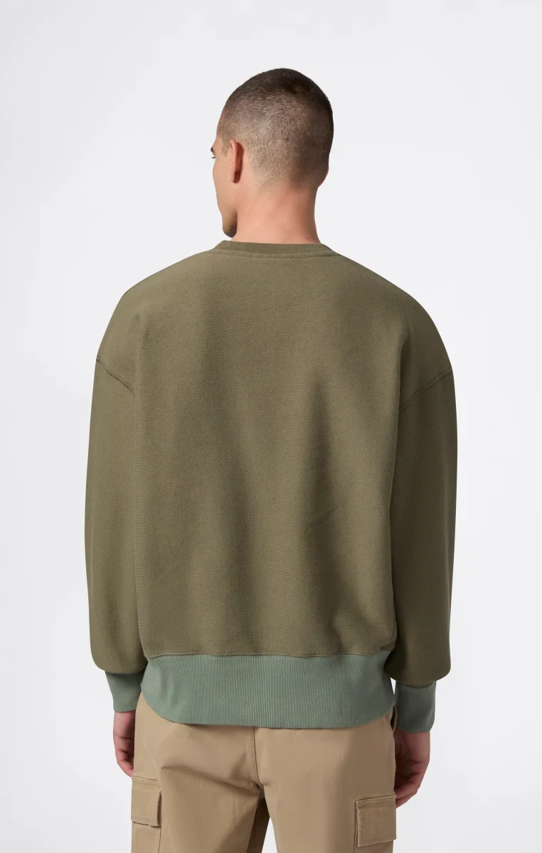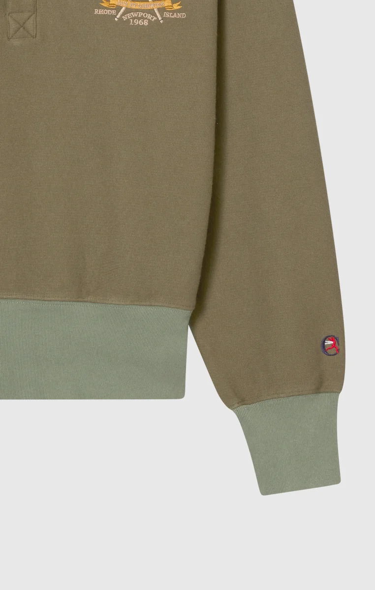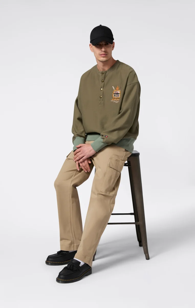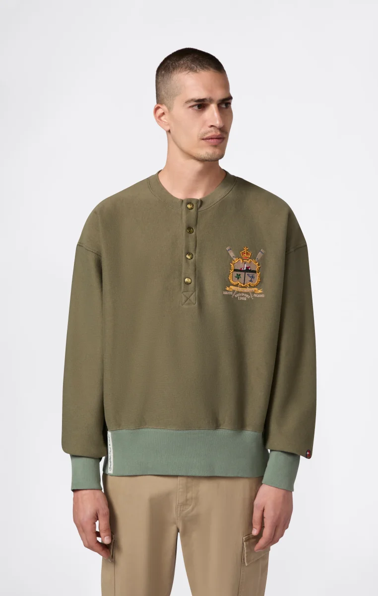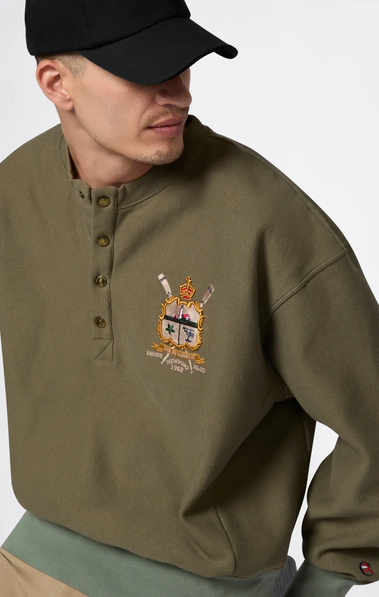 Part of the Lighthouse collection from Index & Archives, this crewneck sweatshirt with buttons offers a contemporary take on Ivy League aesthetics and New England rowing team style. Made from 430 g/m² Reverse Weave – Champion’s iconic patented construction designed to prevent shrinkage – it features contrast ribbed trims and a crest embroidery inspired by archival academic emblems. A true celebration of American collegiate heritage.@@@Fabric: Reverse Weave Fleece 430 g/m² |Composition: 90% Cotton, 10% Polyester |Brushed interior |Opening with four metal buttons |Crest embroidery on chest |Reverse Weave: patented anti-shrink construction since the 1930s |Contrast ribbed hem and cuffs |Woven twill label on the side |Fit: Loose, relaxed fit with dropped shoulders, wide sleeves and regular length