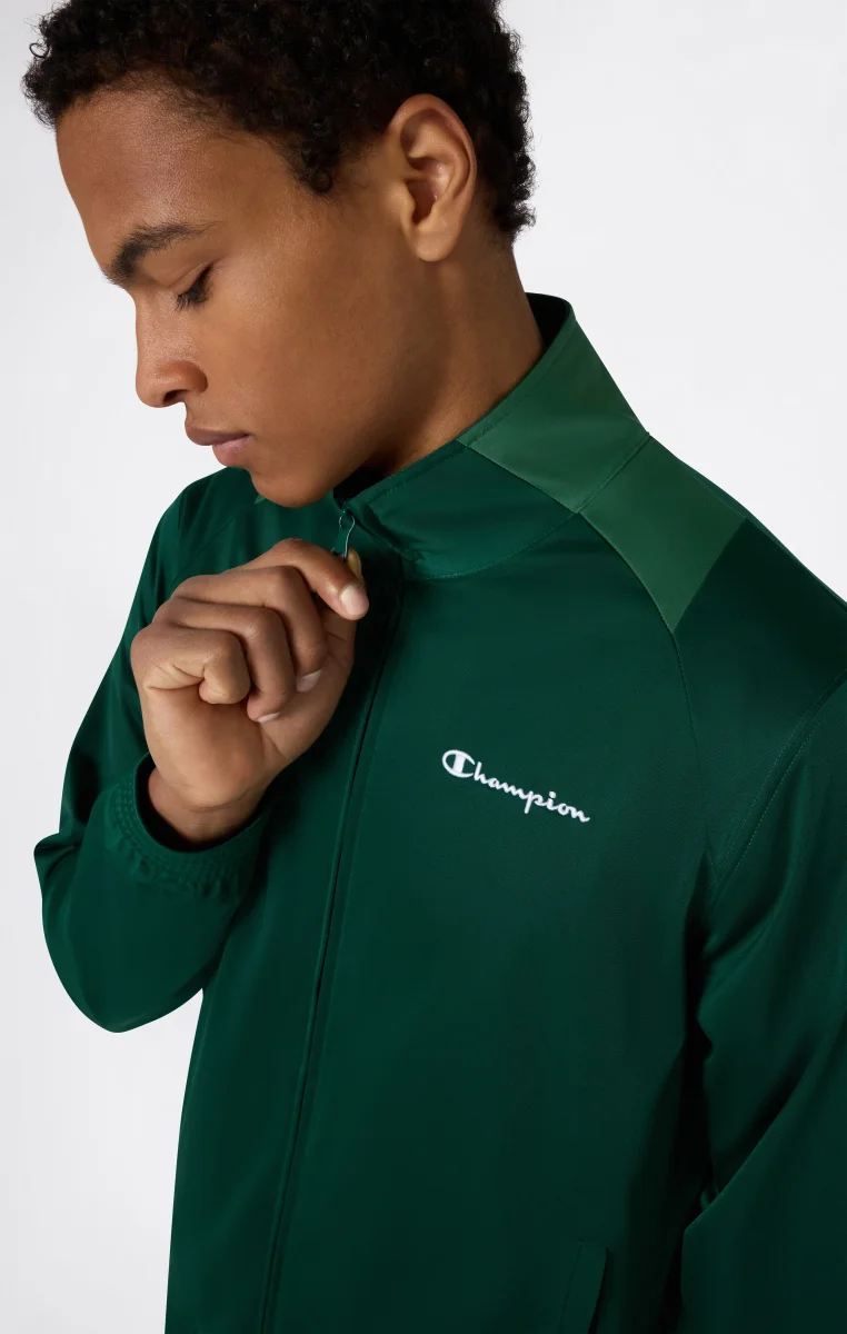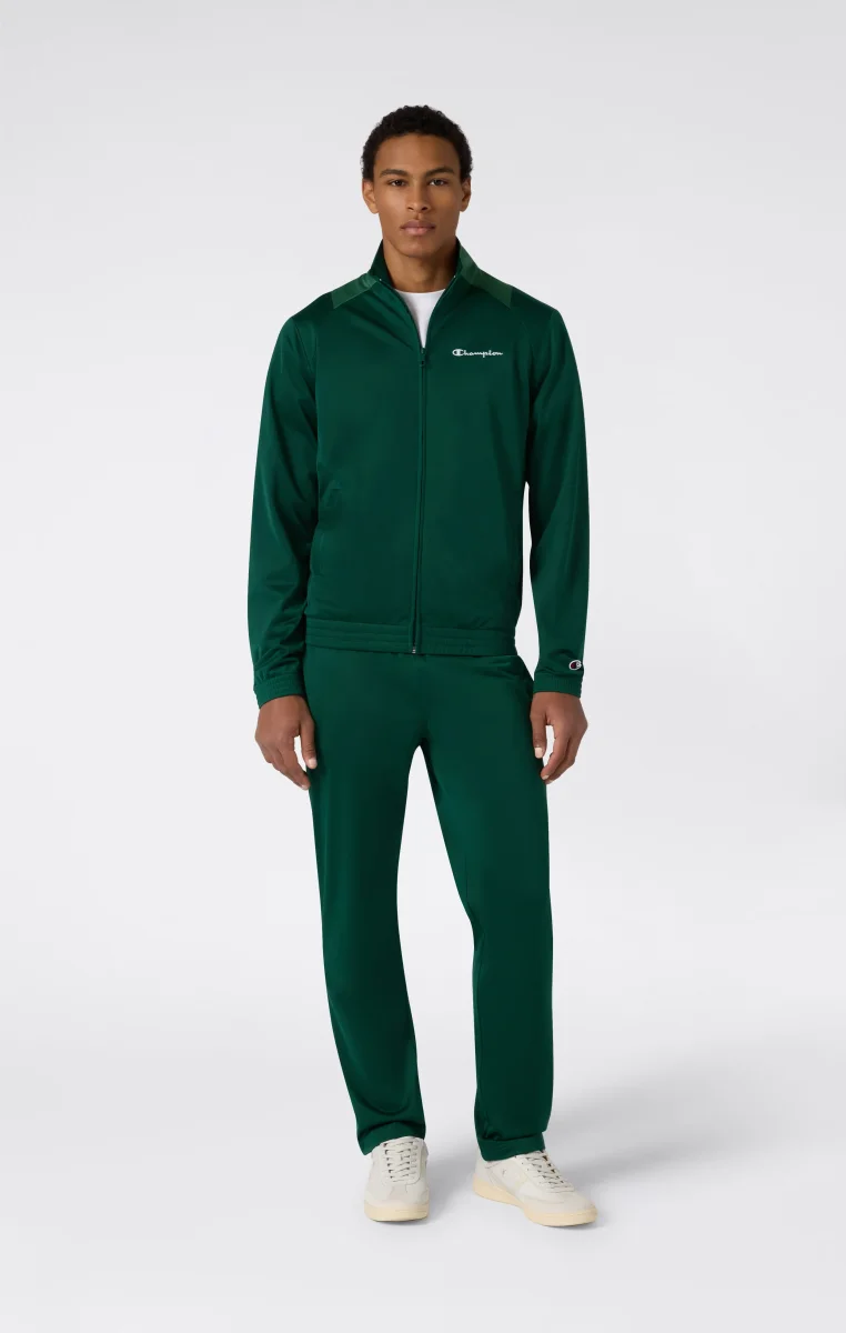 Men’s tracksuit with a clean and essential sportswear design, composed of a full zip sweatshirt and matching pants. Made from lightweight and compact polyester fabric, it ensures comfort and practicality for everyday wear and dynamic activities. The material structure provides a lightweight feel and helps maintain shape over time, while the Slim Fit follows the body’s lines for a modern and streamlined look.@@@Slim Fit, close-fitting and streamlined |Lightweight and compact polyester fabric |Composition: 100% Polyester |Fabric weight: 200 g/m² |Full zip sweatshirt |High collar |Side pockets on the sweatshirt |Elasticated waistband with drawstring on pants |Side pockets on pants |Champion logo applied