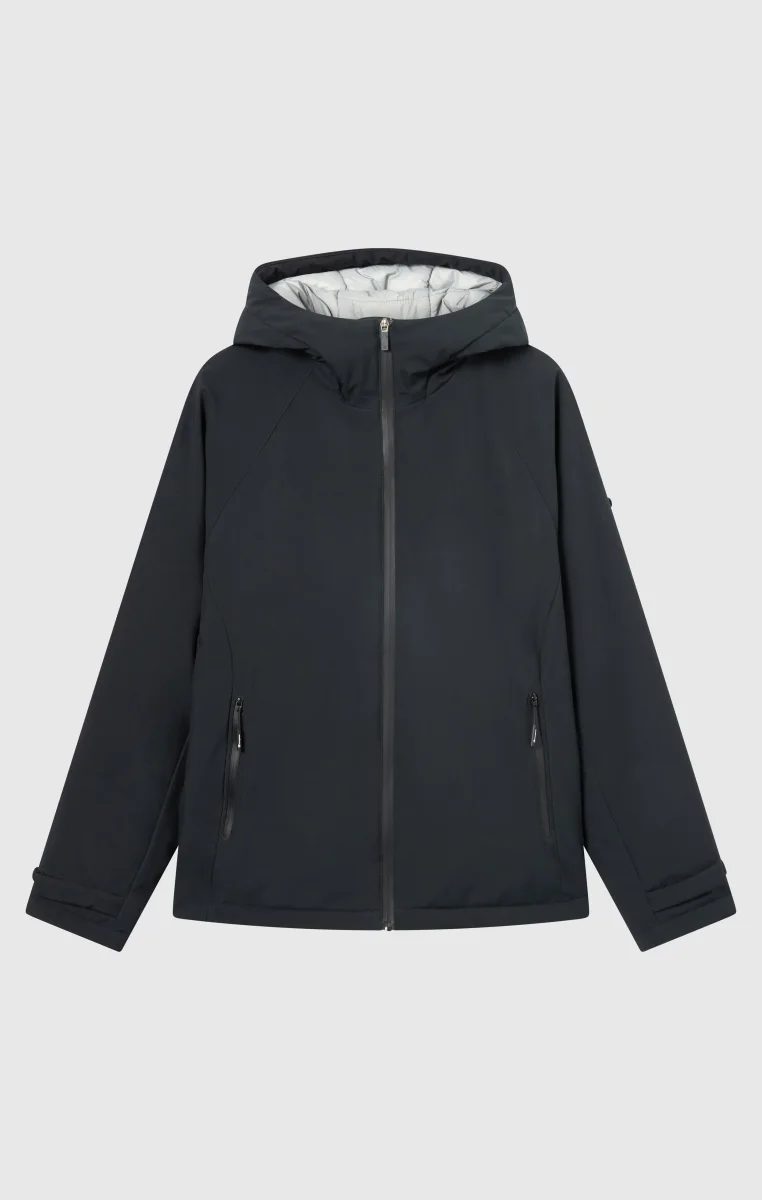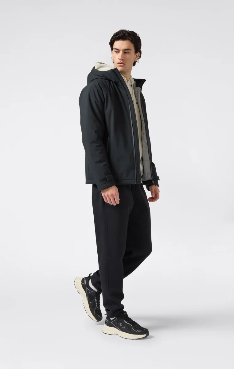 This hooded jacket blends clean aesthetics with a functional technical approach, perfect for cold days in the city or outdoors. The bonded jersey outer with a water-repellent finish protects against the elements, while the 120 g polyester padding provides warmth without bulk. Quilted lining, fixed hood, and heat-sealed zips complete a design built for everyday performance.@@@Fabric: Woven Bonded Jersey, weight: 195 g/m² |Composition: 100% Polyester |Lining: Light nylon – 35 g/m² |Padding: 120 g Polyester |Water-repellent treatment |Fixed hood |Heat-sealed front zip |Heat-sealed zip side pockets |Adjustable cuffs with velcro |Standard Fit: Versatile and comfortable fit with standard width and length. Close to the body with simple lines that do not shape the figure. Regular shoulder cut.