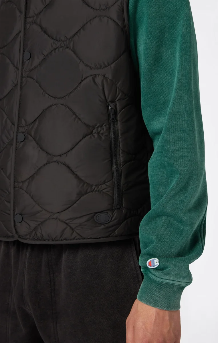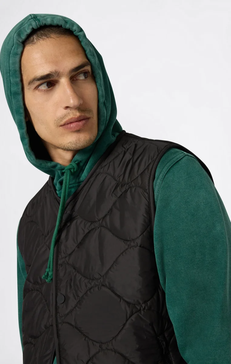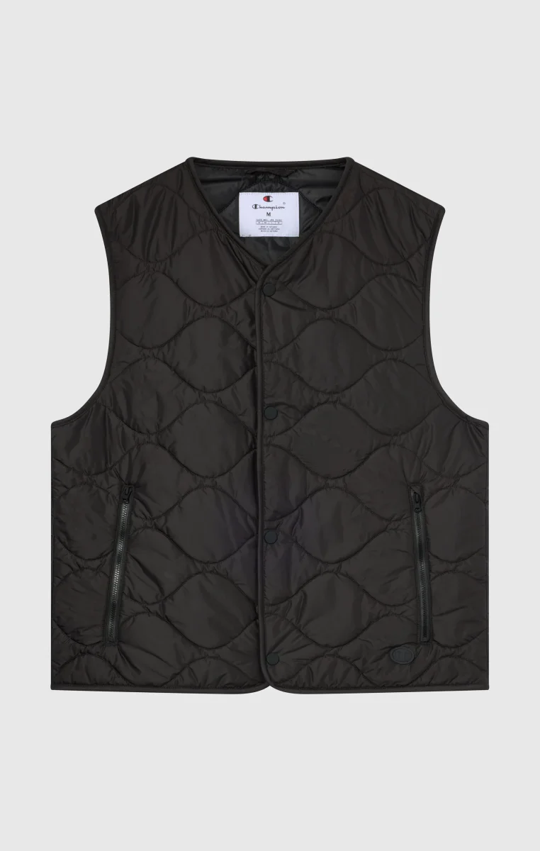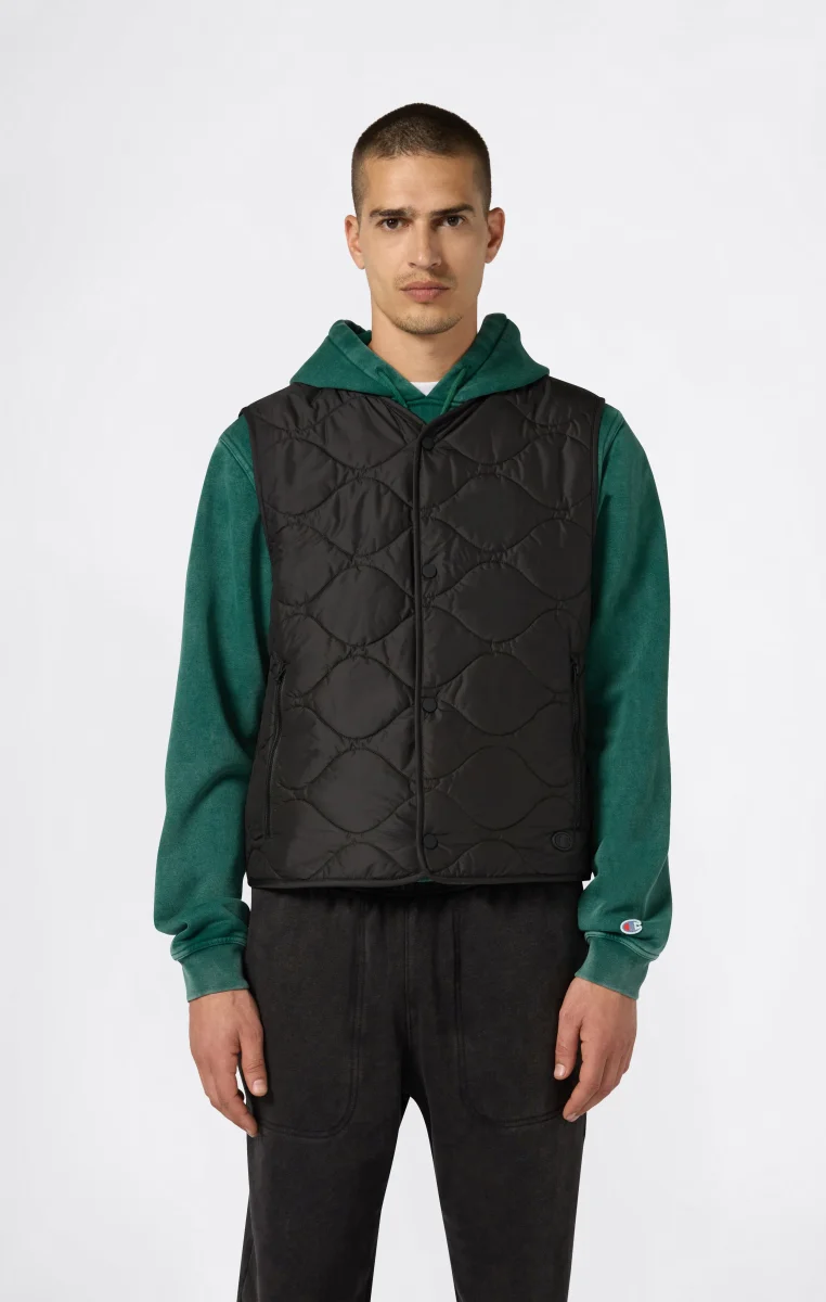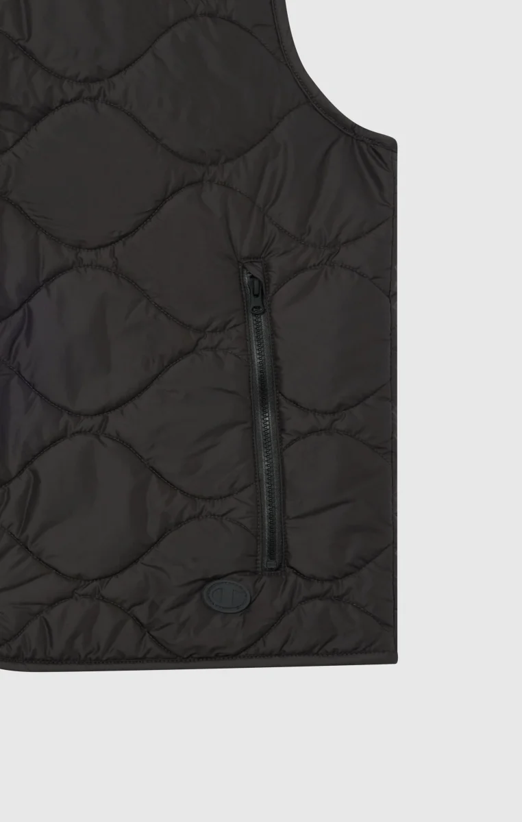 This padded vest is perfect for adding an extra layer during cooler months. Made from technical polyester with graphic quilting, it’s lightweight yet functional, thanks to the 60 g Repreve padding that provides thermal comfort while respecting the environment. It features a snap button front closure and zip pockets for maximum practicality on the go.@@@Fabric: Ciré Woven Poly, weight: 39 g/m² |Composition: 100% Polyester |Padding: Repreve (60 g) |Graphic quilting |Snap button closure |Side zip pockets |Sleeveless |Fit: Standard Fit: Versatile and comfortable fit with standard widths and lengths. Close to the body, it has simple lines that do not cling to the shape. Regular shoulder cut.