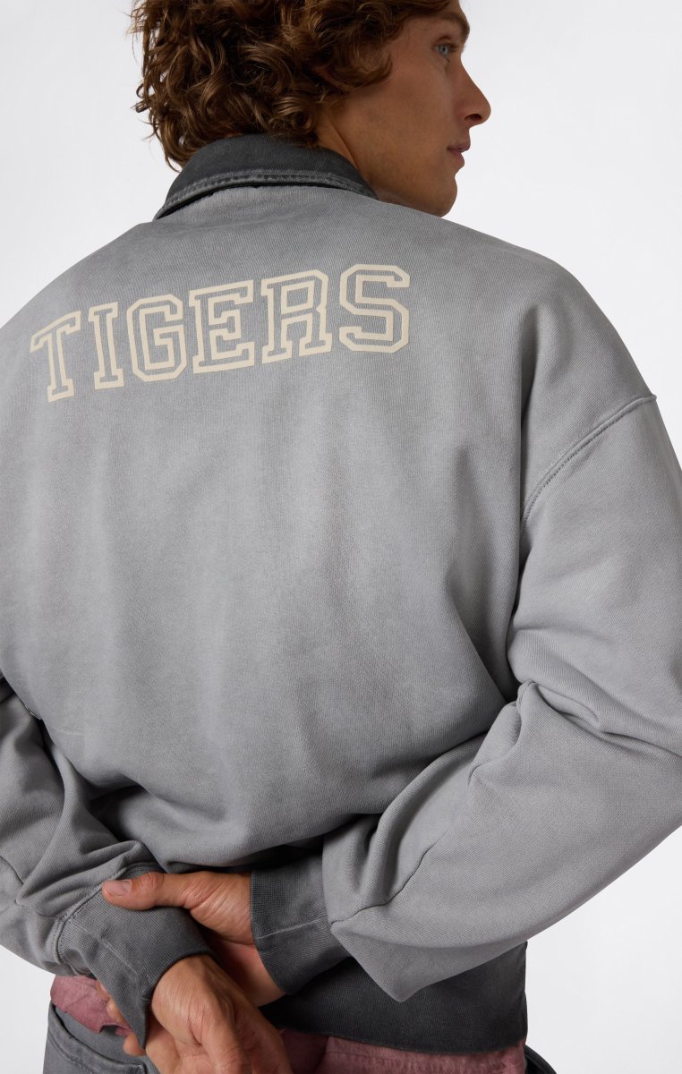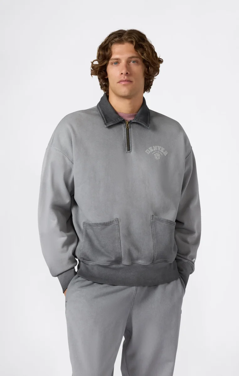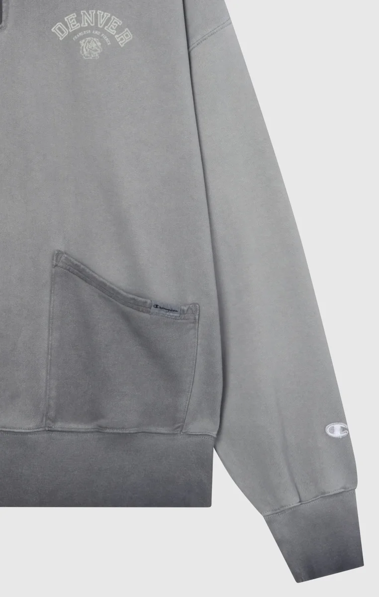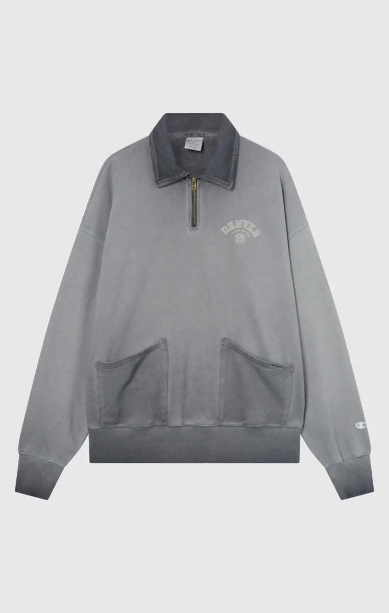 This polo collar zip-up sweatshirt is a modern tribute to American heritage aesthetics. Part of the Time Capsule collection, it combines vintage sporty style with authentic archival details like the flock graphic and Luna Dye wash that gives the garment a unique faded effect, richer inside. The loose fit and dropped shoulder enhance comfort, while the front pockets and structured collar with metal zipper add a distinctive touch.@@@Fabric: Heavyweight French Terry – 510 g/m² |Composition: 100% Cotton |Luna Dye wash for a heritage faded effect |Flock graphic inspired by original Champion archives |Polo collar with metal zip |Coach-style front pockets |Tone-on-tone patch on the sleeve |Fit: Loose Fit – wide cut with dropped shoulder