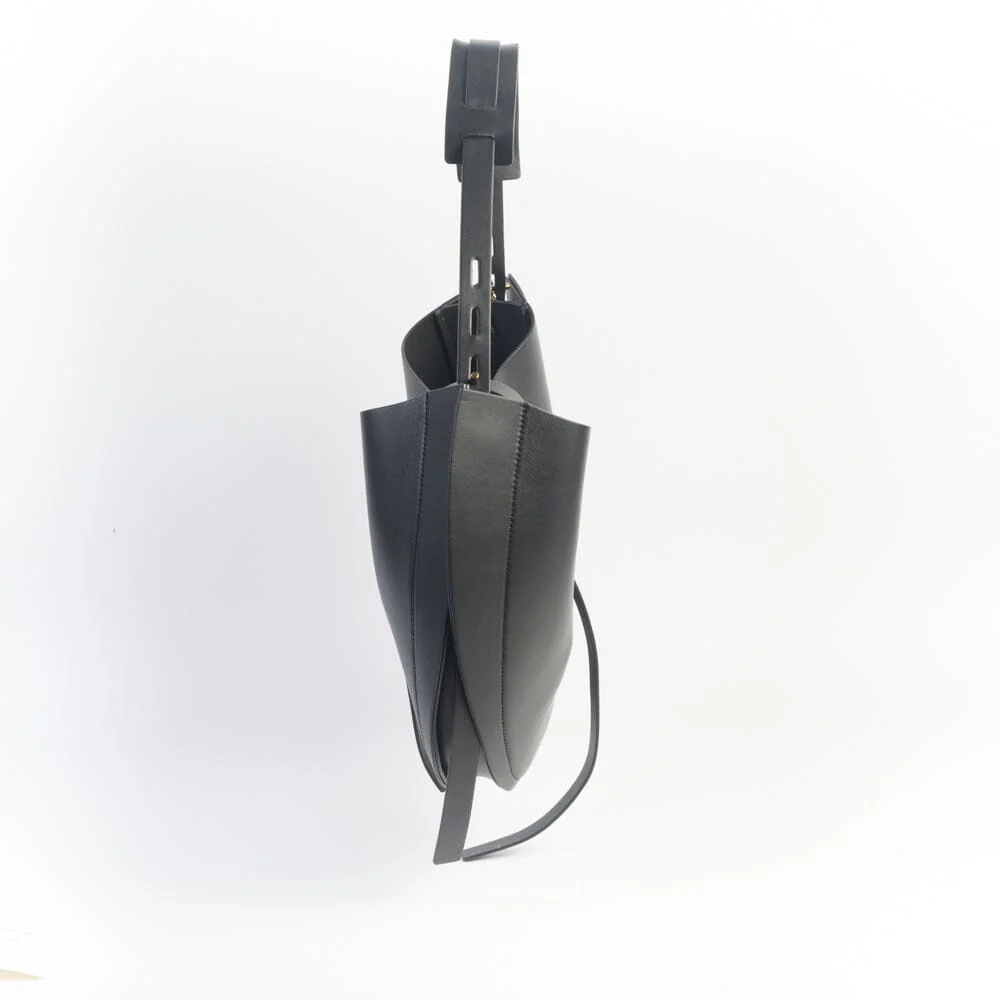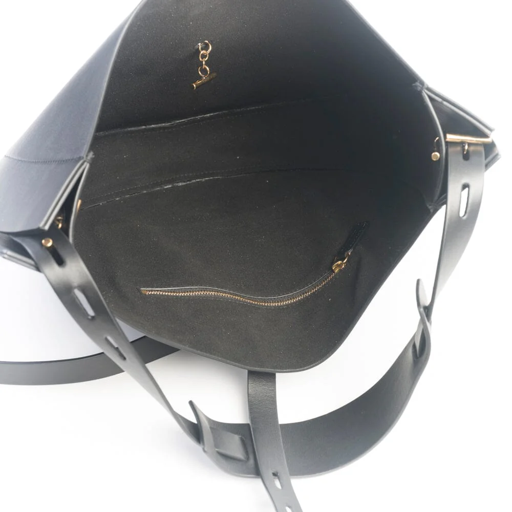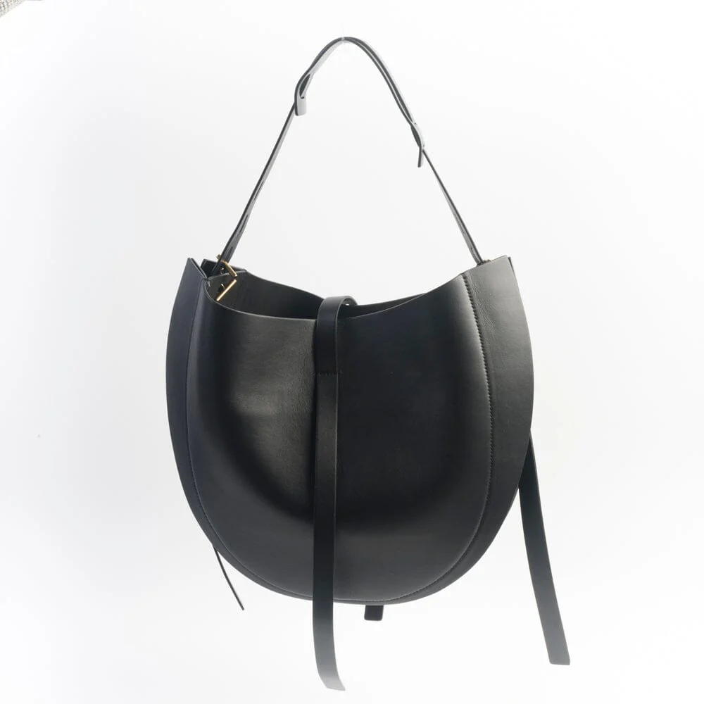 Borsa a spalla modello hobo di MINOBOSSI realizzata in pelle di vitello liscio di colore nero. Chiusura con cinturino in pelle e gancetto di colore oro. Unico manico regolabile in pelle da portare a spalla. Fodera interna in pelle scamosciata con taschino chiuso da zip.