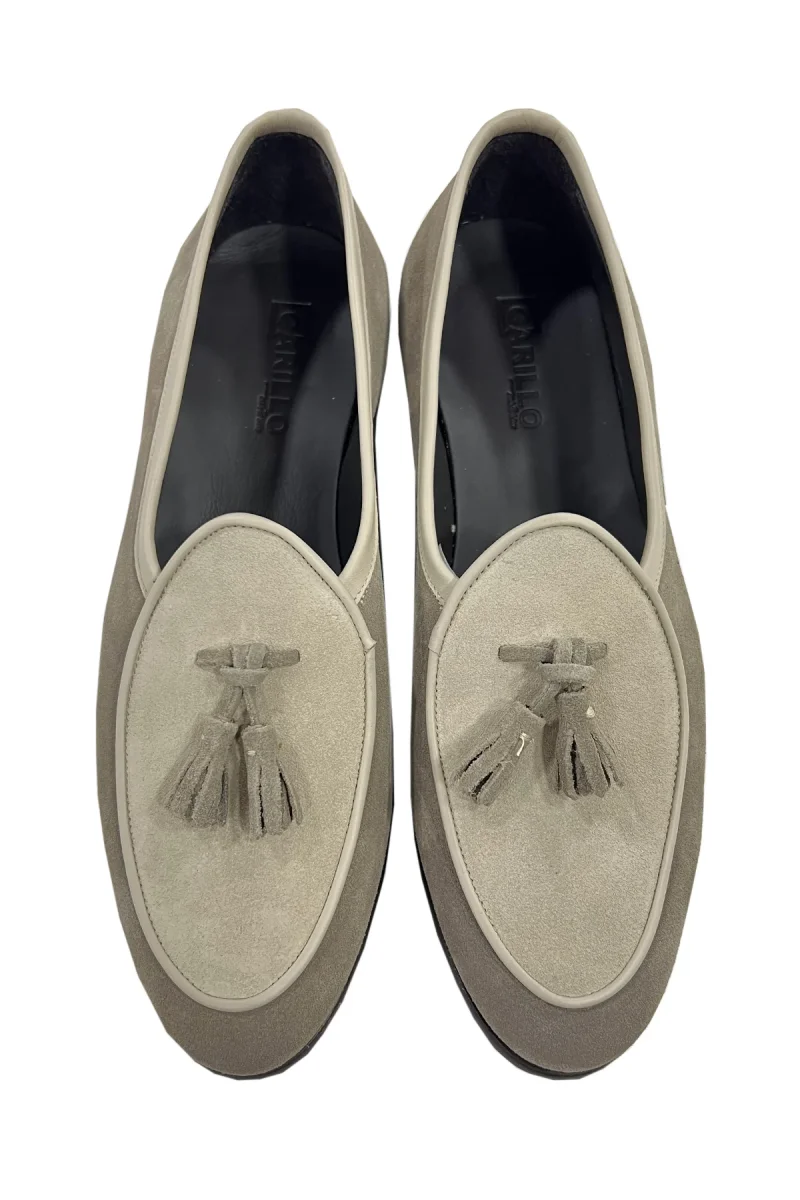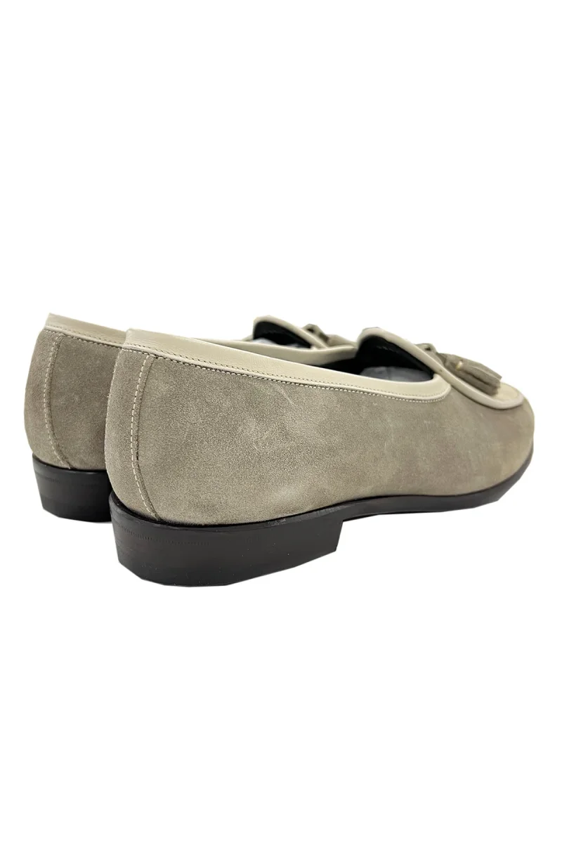 Mocassini uomo beige e fango bicolore in camoscio con nappine profili e interno in vera pelle suola in cuoio made in italy fatte a mano