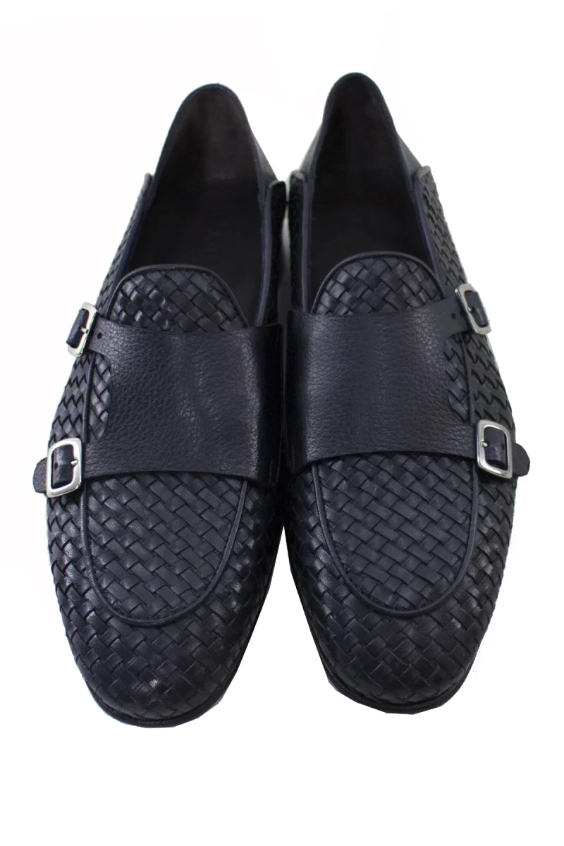 Mocassini uomo blu in vera pelle intrecciata con doppia fibbia