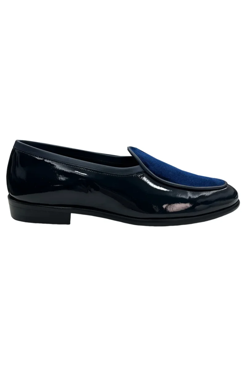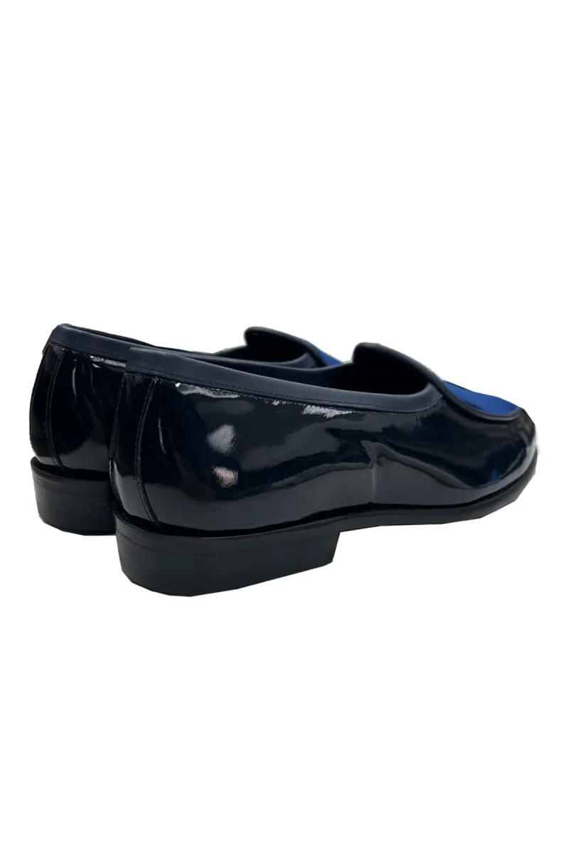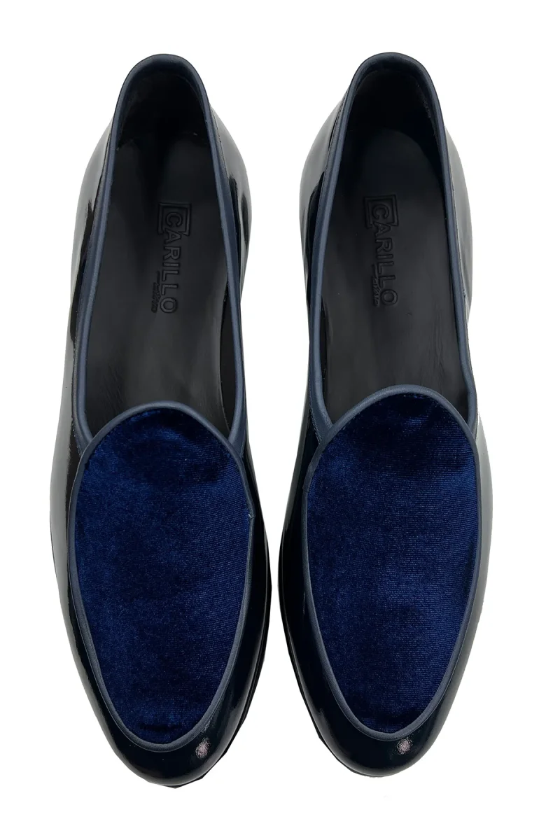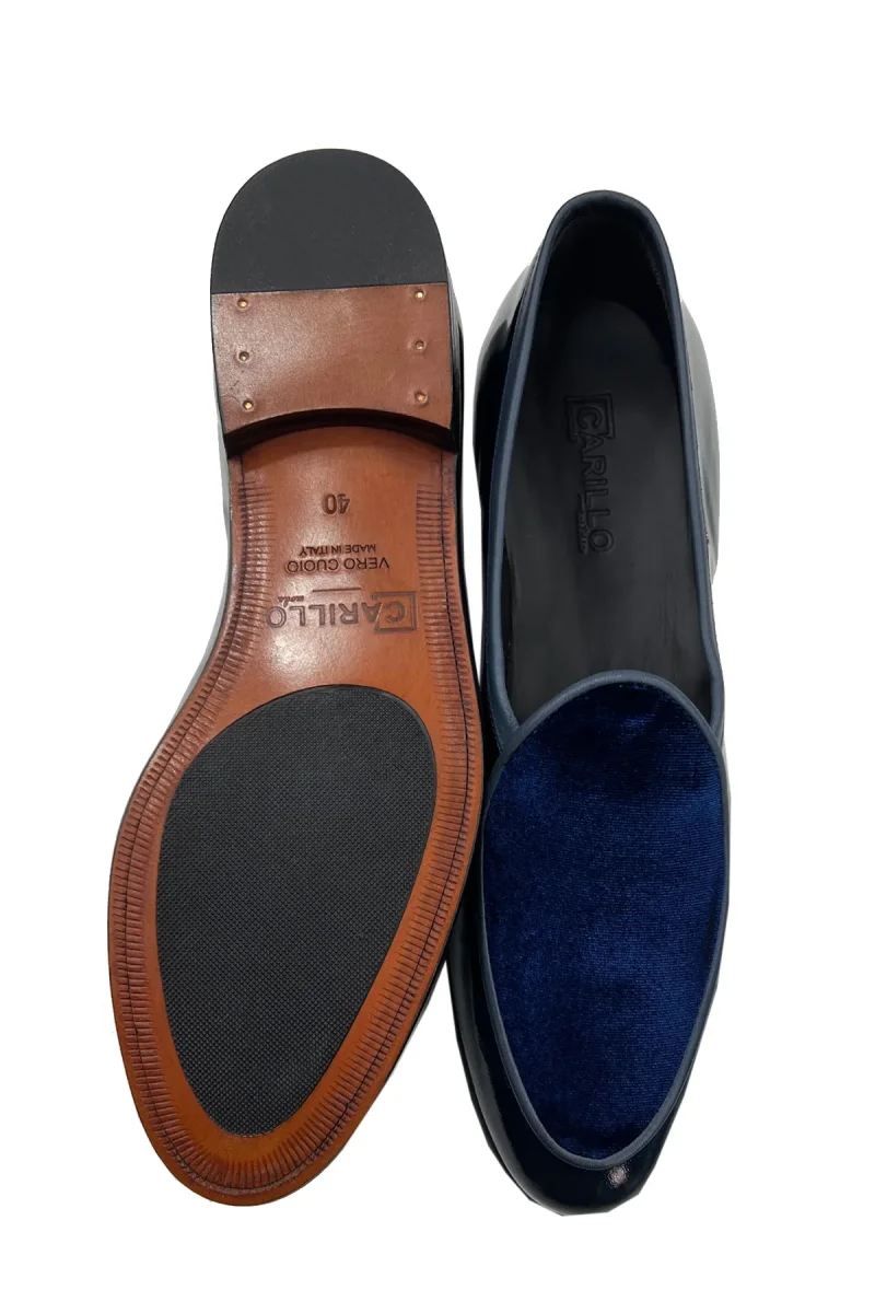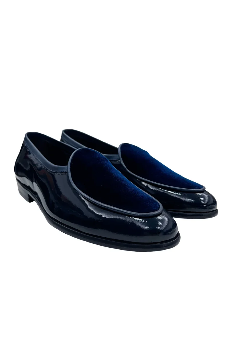 Mocassini uomo blu vernice e velluto in vera pelle con suola in cuoio fatte a mano con bordino in pelle blu sul profilo del collo made in italy