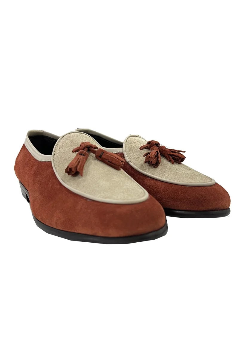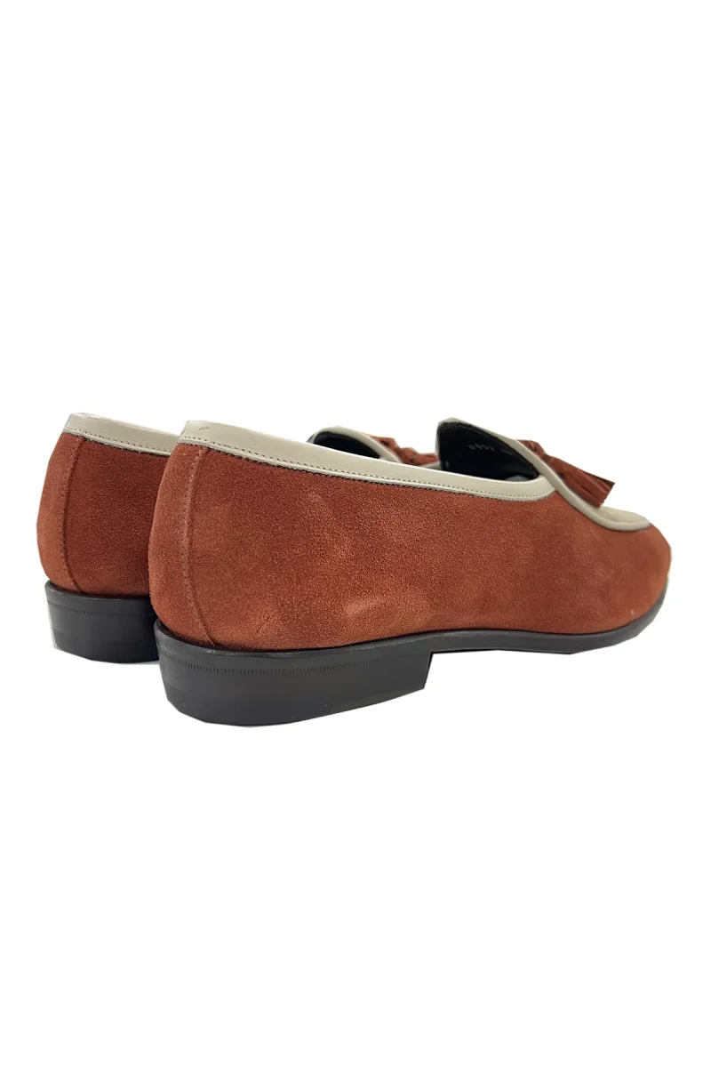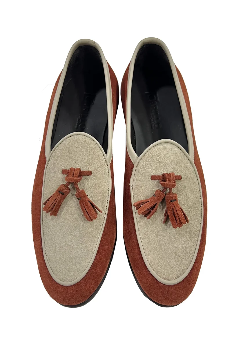 Mocassini uomo coccio e beige bicolore in camoscio con nappine profili e interno in vera pelle suola in cuoio made in italy fatte a mano
