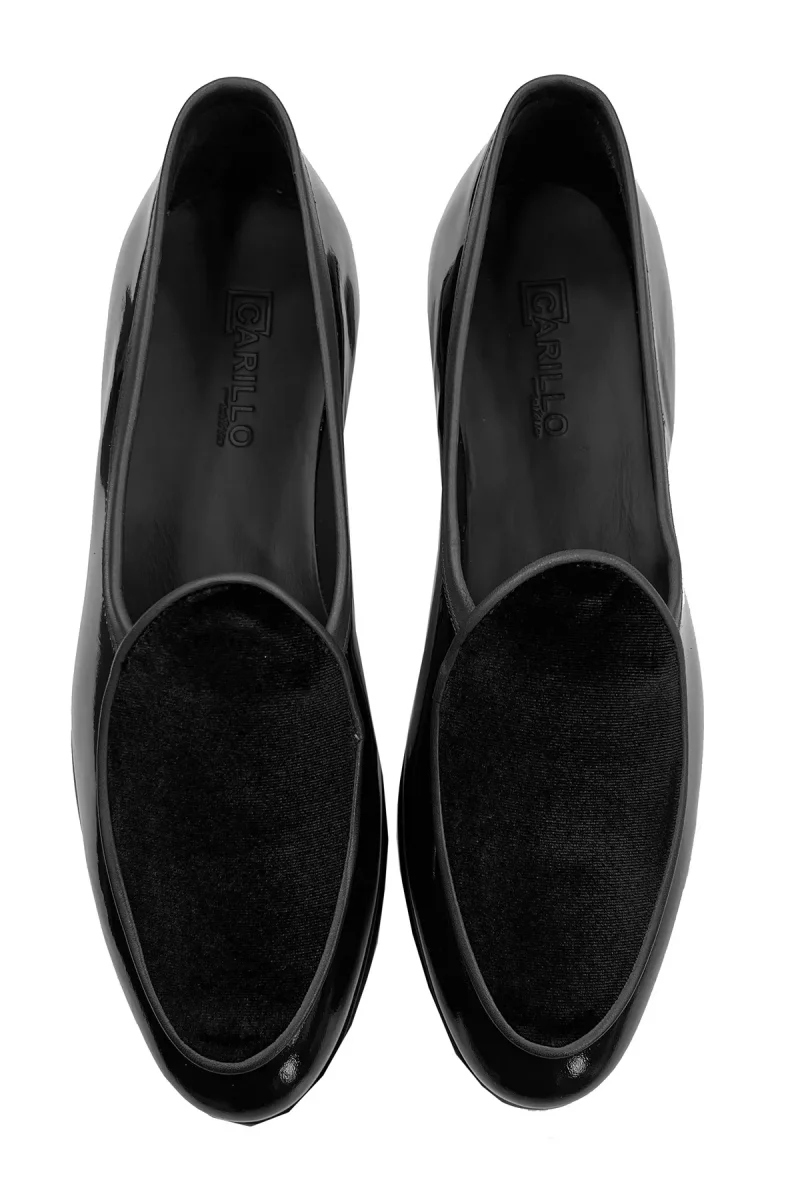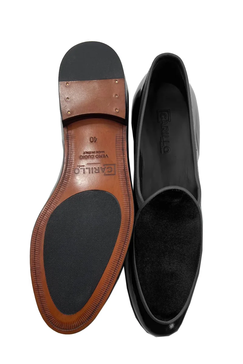 Mocassini uomo neri in vernice e velluto in vera pelle con suola in cuoio fatte a mano con bordino in pelle blu sul profilo del collo made in italy