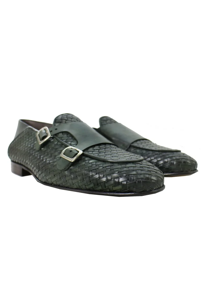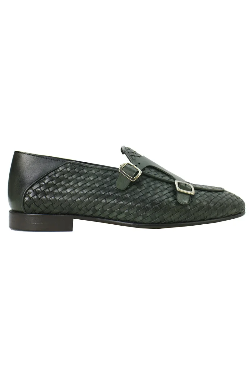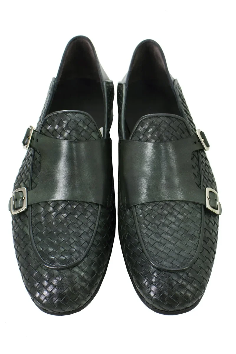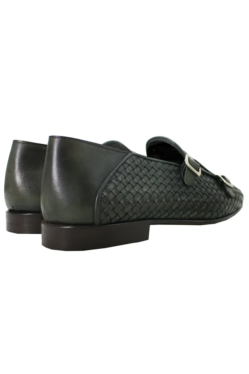 Mocassini uomo verde militare in vera pelle intrecciata con doppia fibbia