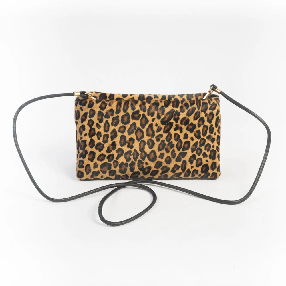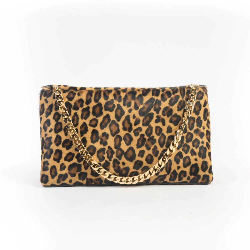 Borsetta a mano di MOULIEBRE realizzata in cavallino fantasia animalier di colore marrone, beige e nero. Catenella di colore oro da portare a spalla o senza come pochette. Chiusura con bottone magnetico. Interno foderato in tessuto di colore nero. Tracolla tubolare in pelle nera per portare la borsetta anche a tracolla. In dotazione, sacchetto in tessuto anti-polvere e portachiavi a forma di cuore distintivo del brand. All’interno di ogni borsa il portachiavi ha colori diversi.