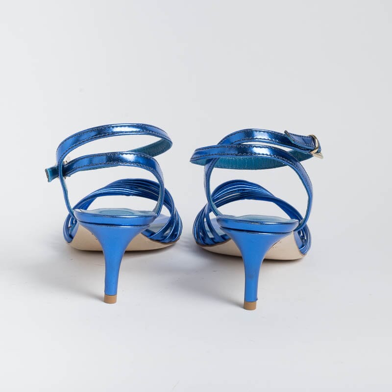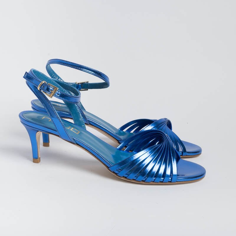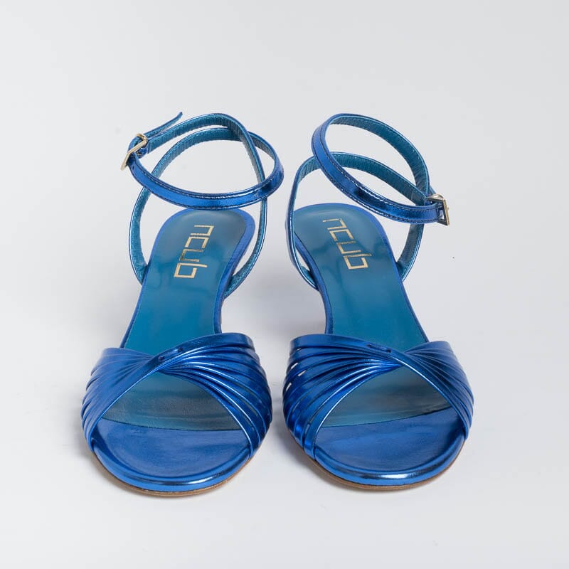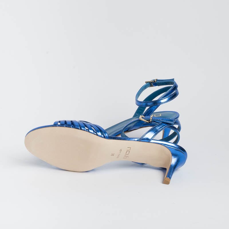 Sandali di Ncub realizzati in simil pelle laminata di colore bluette. Decorazione con fascia risvoltata. Doppio cinturino e chiusura alla caviglia. Sottopiede in vera pelle. Suola in cuoio. Tacco stiletto rivestito in pelle di altezza 6 centimetri.
