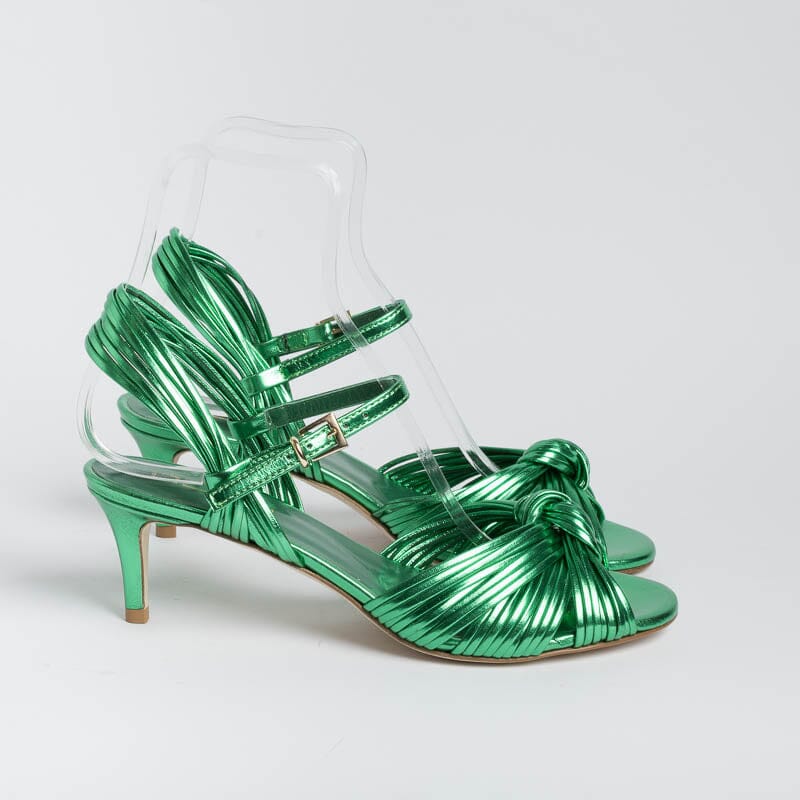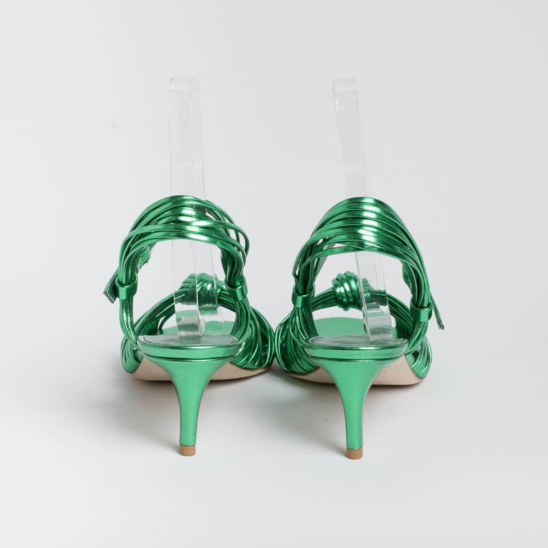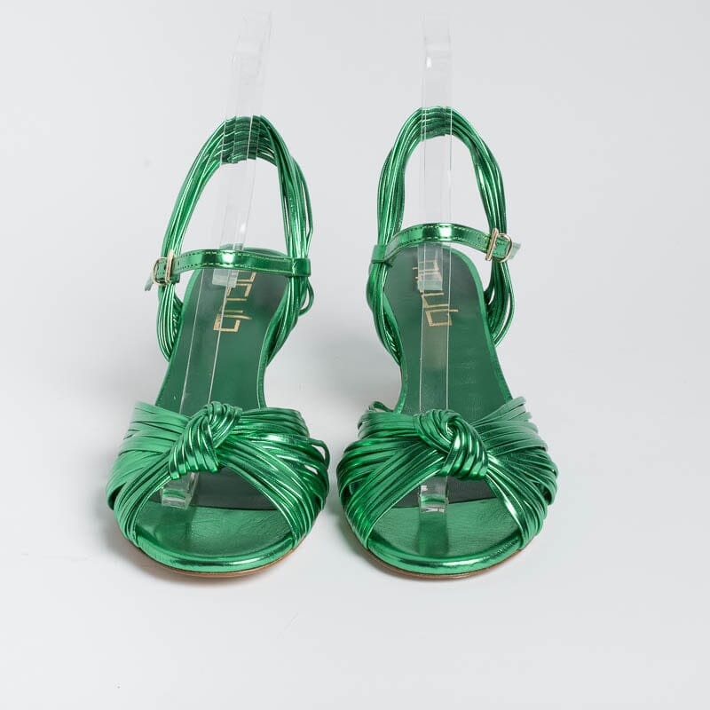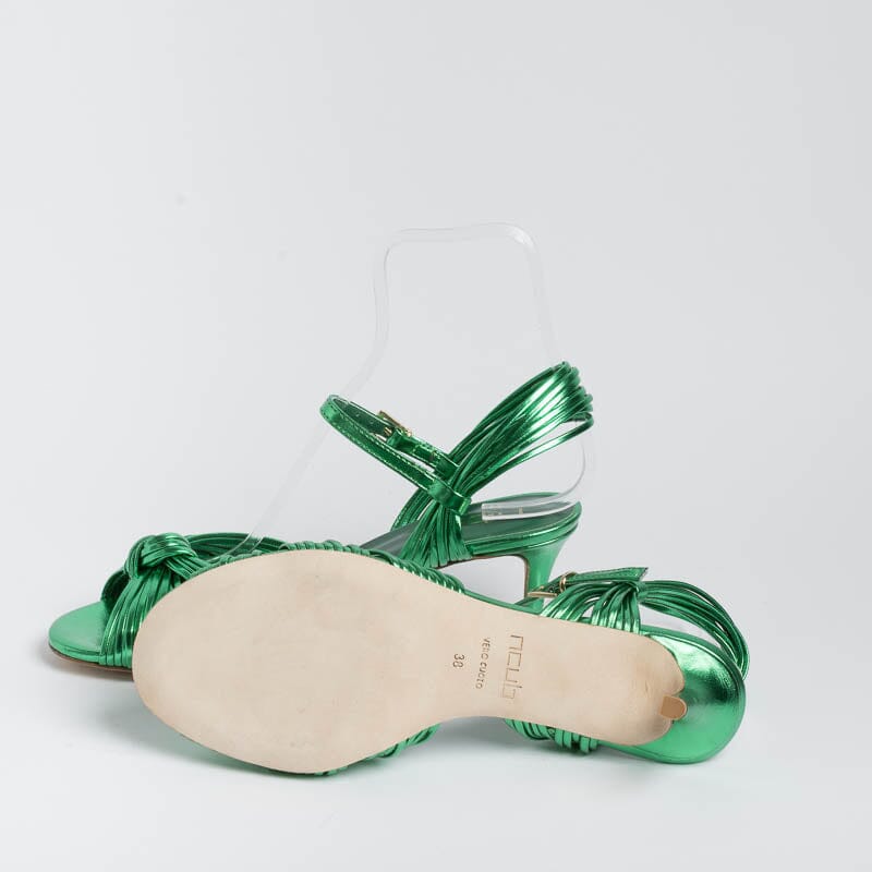 Sandali di Ncub realizzati in simil pelle laminata di colore verde. Decorazione con fasce annodate sulla parte anteriore. Dettaglio sul tallone con fasce sottili e chiusura con cinturino alla caviglia. Sottopiede in vera pelle. Suola in cuoio. Tacco stiletto rivestito in pelle di altezza 6 centimetri.