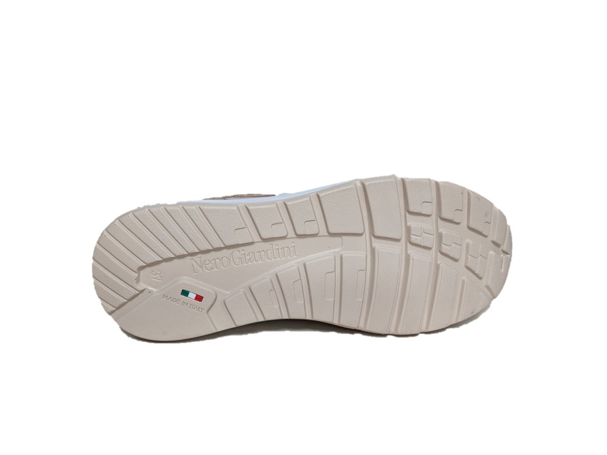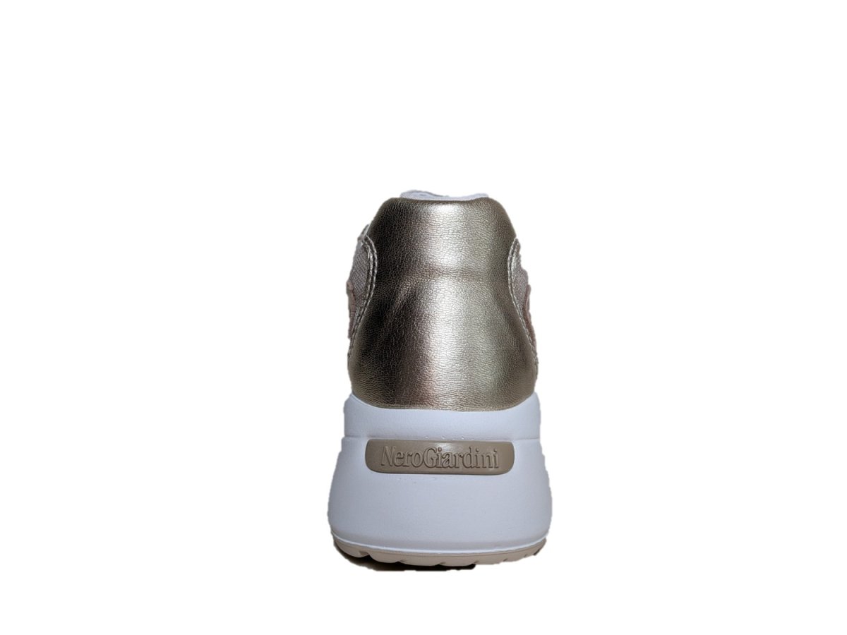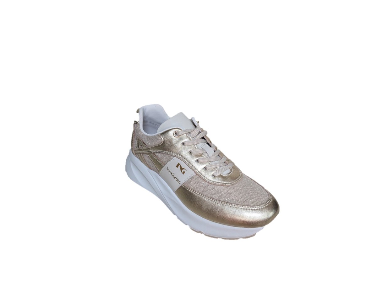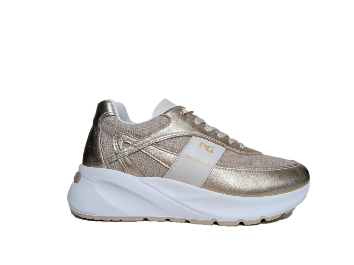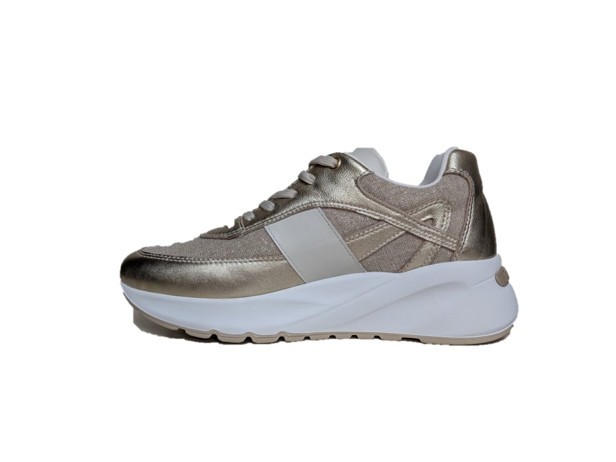 Sneakers in pelle colore miele e tessuto, suola in gomma, sottopiede estraibile