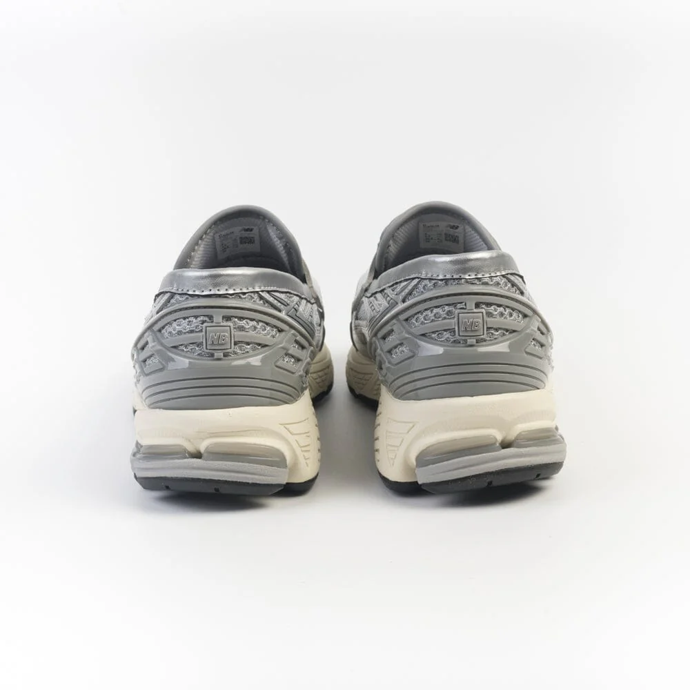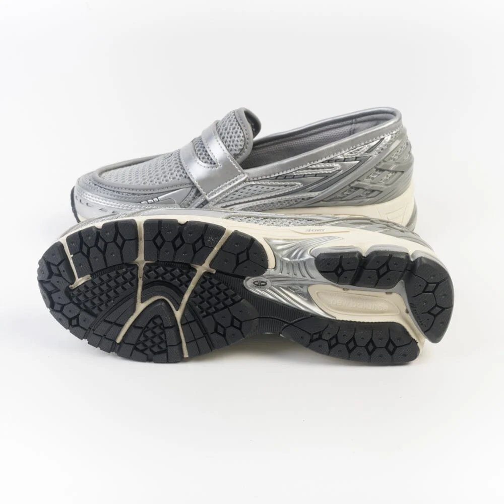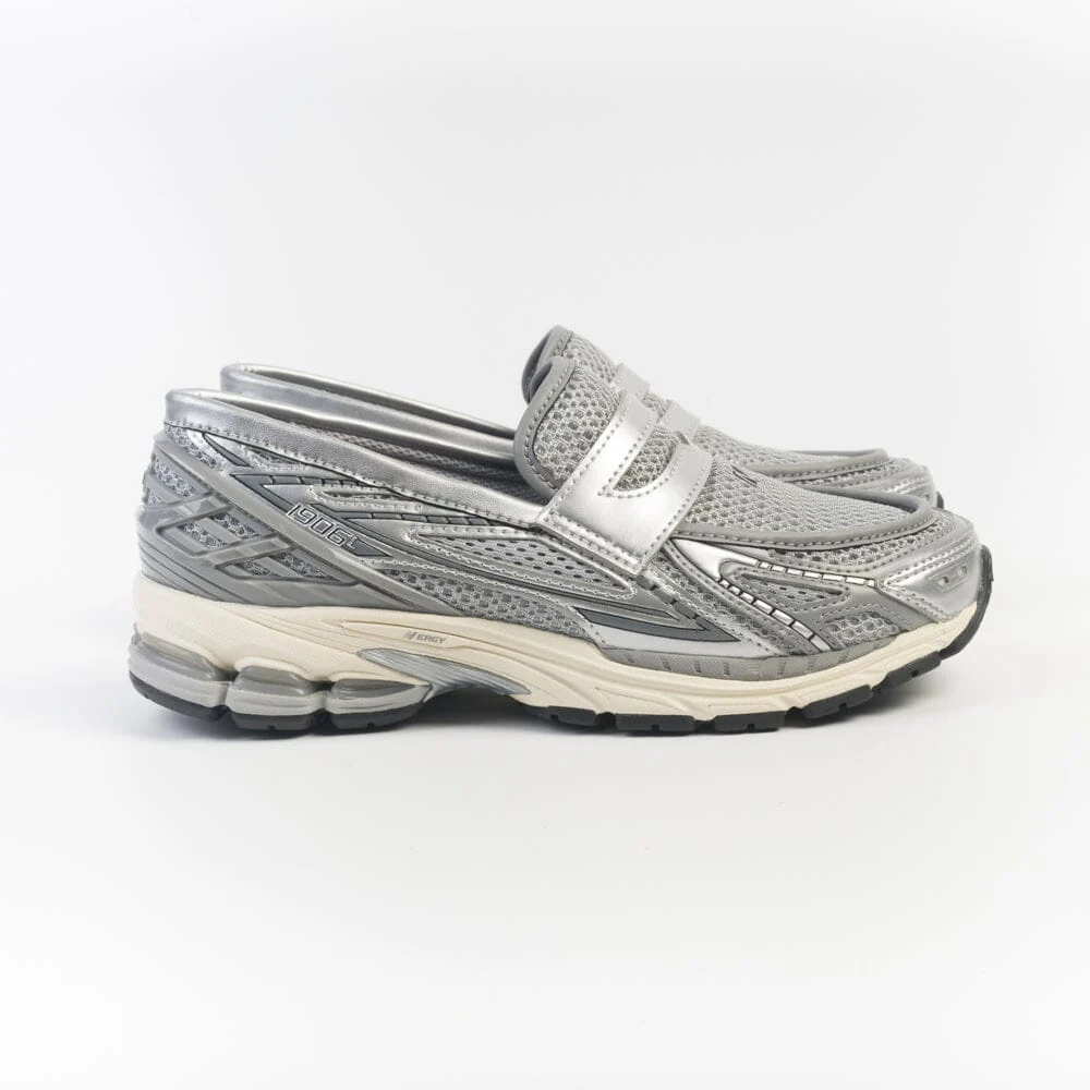 Nuove Loafer 1906 di New Balance, un abbinamento di scarpe da ginnastica e da abiti più formali che riprendono il gusto del mocassino. Realizzata in mesh di colore grigio e materiale gommato in nuance. Tallone rinforzato in gomma di colore grigio.