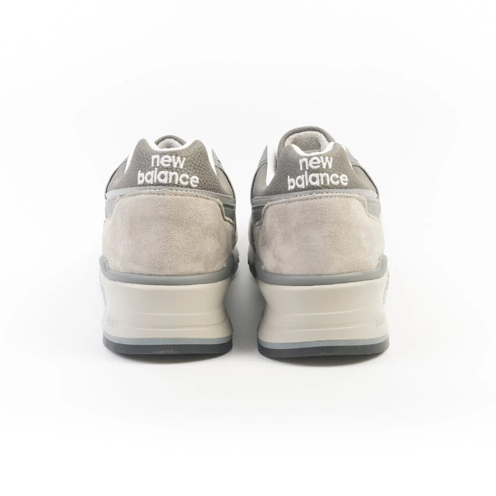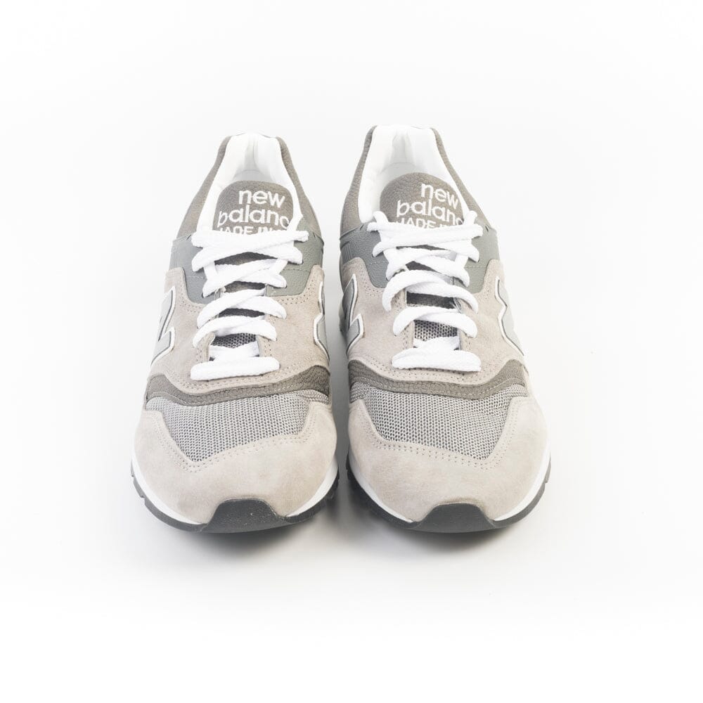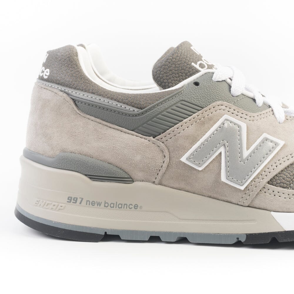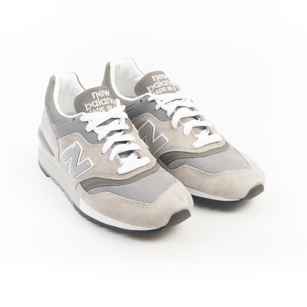 Sneakers serie 997 di New Balance, realizzate in mesh e camoscio nel colore grigio iconico con inserti in pelle martellata di colore grigio scuro. N laterale in pelle di colore grigio. Fondo in gomma grigio. Lacci di cotone bianchi.