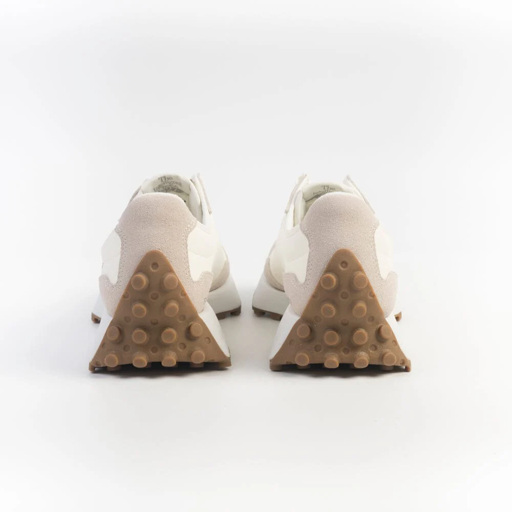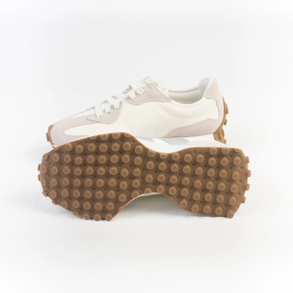Sneakers Serie 327 di New Balance realizzate in materiale gommato di colore avorio e camoscio beige. Dettaglio N laterale in pelle di colore argento, leggermente stropicciata. Lacci in cotone di colore bianco. Suola in gomma con grip.